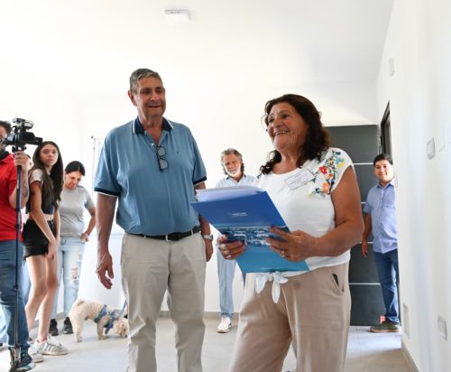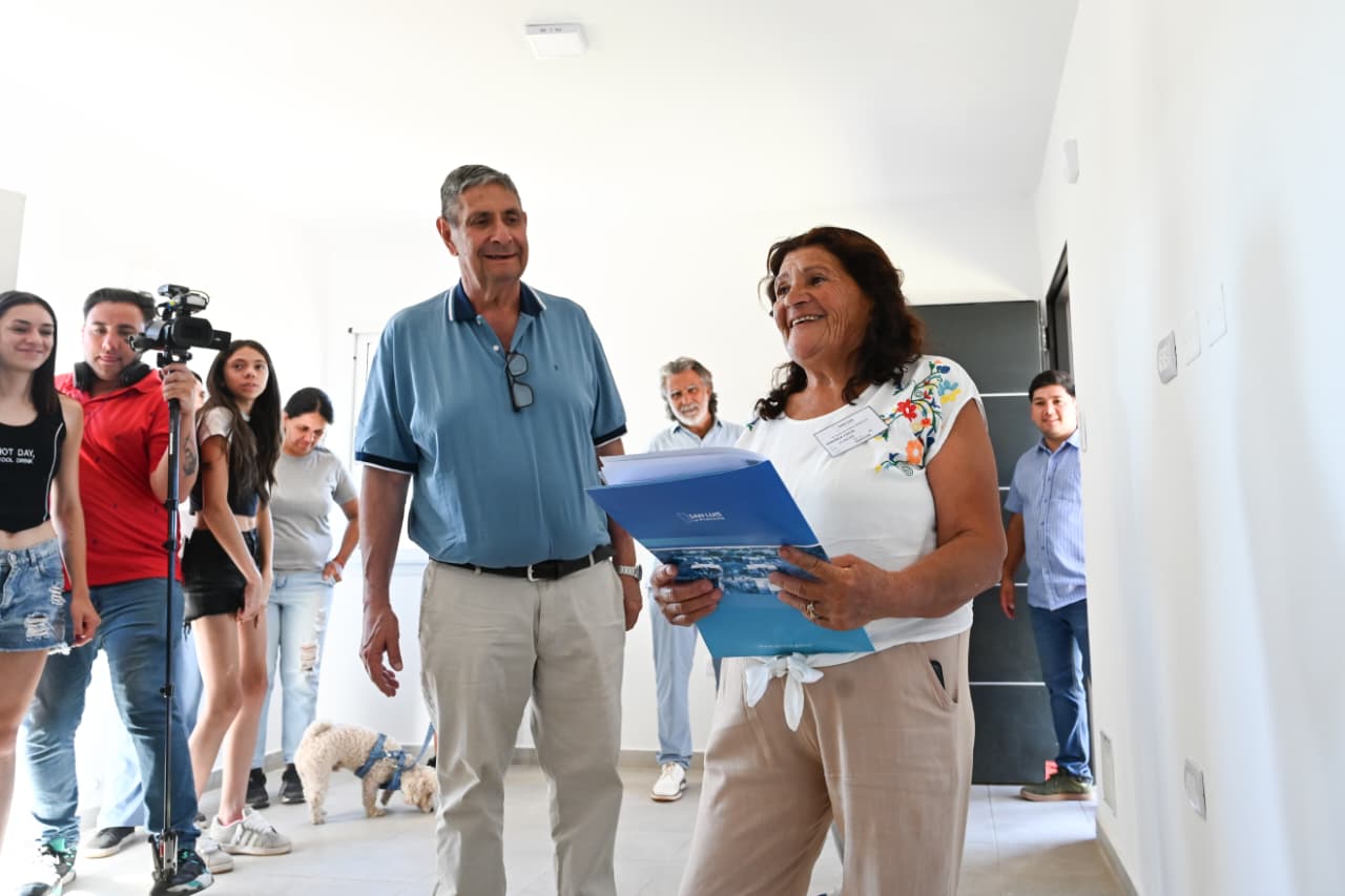 “Ustedes más que nadie saben lo que tuvieron que pasar para llegar a esto”, les dijo Hugo Rossi, secretario de Política Habitacional, antes de colgarle la llave al cuello.