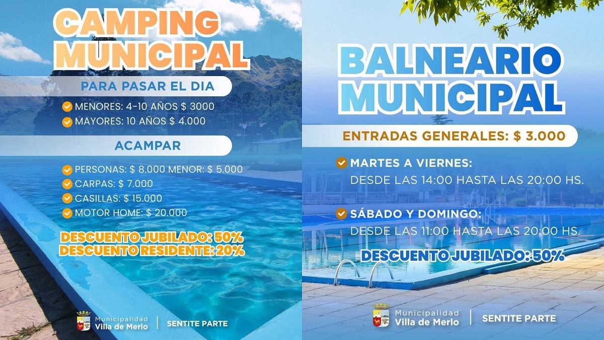 Llegó el verano, las altas temperaturas se hacen sentir, y las familias comienzan a pensar diferentes alternativas para disfrutar las vacaciones. En ese sentido, la Villa de Merlo, el destino turístico más elegido de la provincia, posee un Camping y Balneario Municipal, dos complejos muy convocantes en la temporada estival. Se destacan por su ubicación estratégica, los diversos servicios e instalaciones que ofrecen, pero principalmente por su bajo costo, con tarifas accesibles para todos los bolsillos.