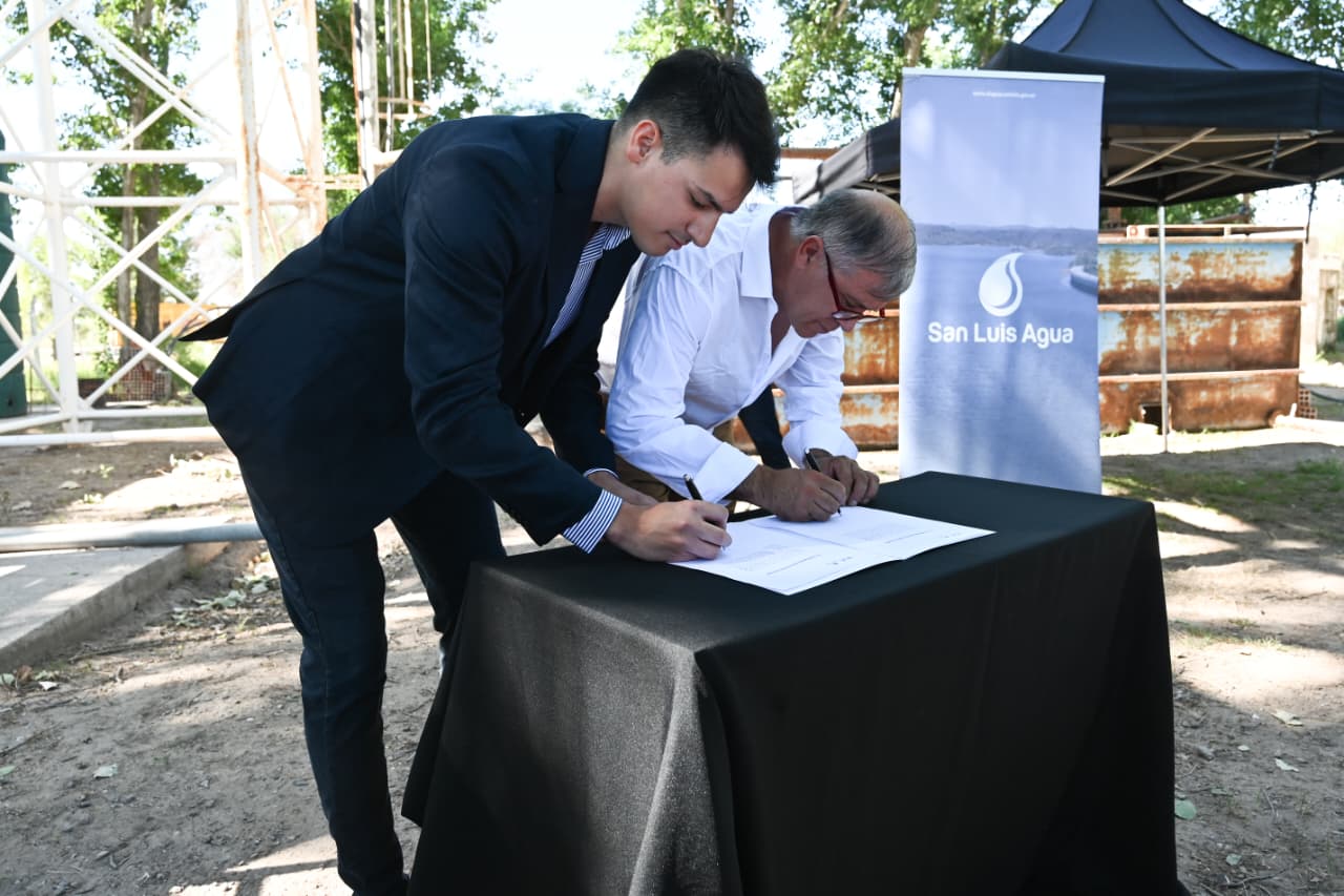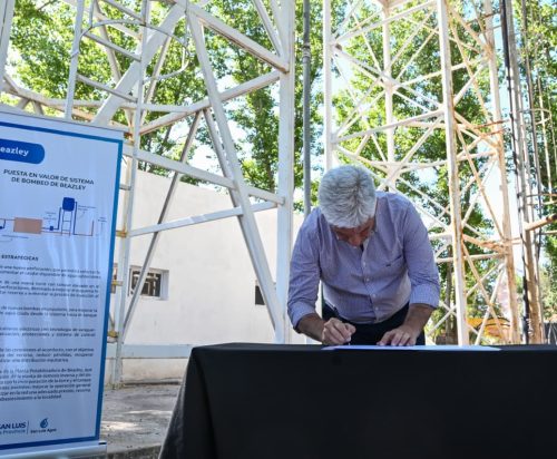 En la planta potabilizadora de la localidad firmó, junto con el Intendente y el gerente operativo de San Luis Agua, Juan Francisco López, el acta compromiso para garantizar el abastecimiento de agua cruda desde el paraje Los Coros hacia Beazley y normalizar la distribución del servicio. Además, rubricó el decreto que habilita la ejecución de una nueva perforación, una obra que reforzará la captación y ampliará el caudal disponible.