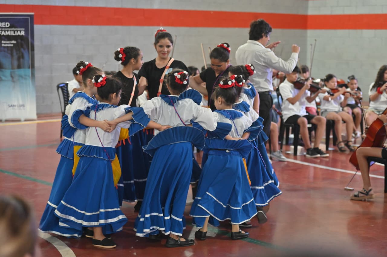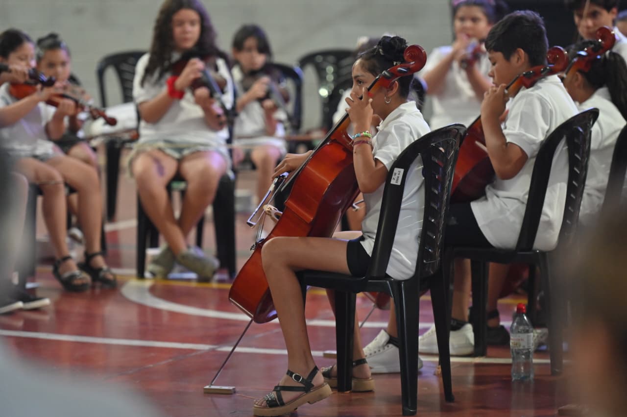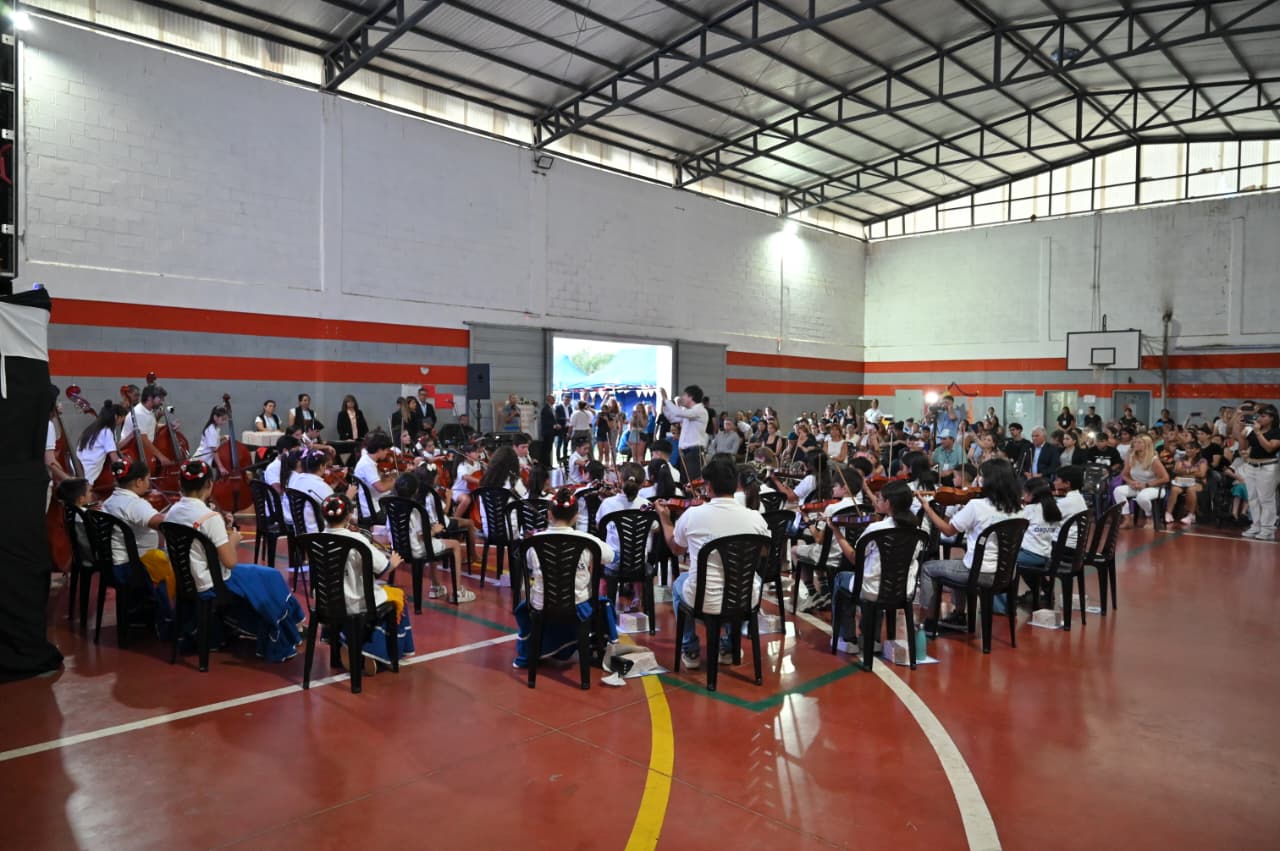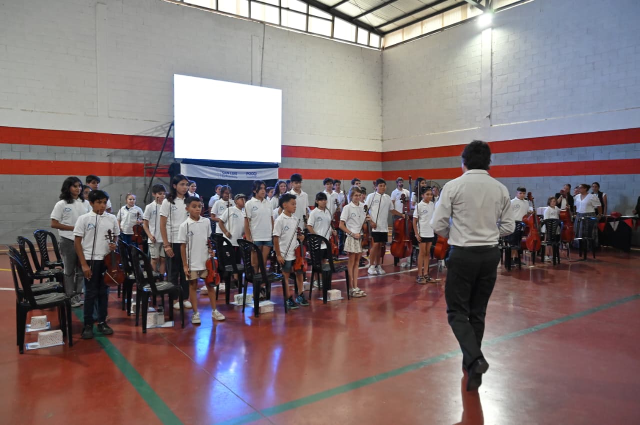 La orquesta infantojuvenil ‘Melodías Serranas’ realizó una presentación especial de fin de año este martes en el Centro N°4 de la Red de Acompañamiento Familiar, ubicado en el corazón del barrio Eva Perón. El grupo está integrado por 60 chicos y chicas, la mayoría de la zona, que forman parte del Sistema de Orquestas que impulsó el Gobierno, con el fin de promover la integración a través de los valores y enseñanzas que se necesitan para integrar un equipo musical.