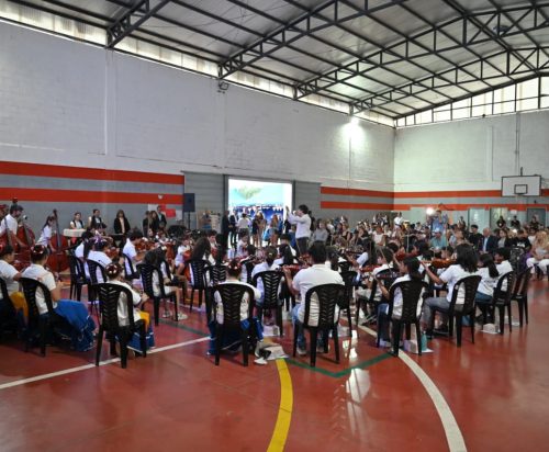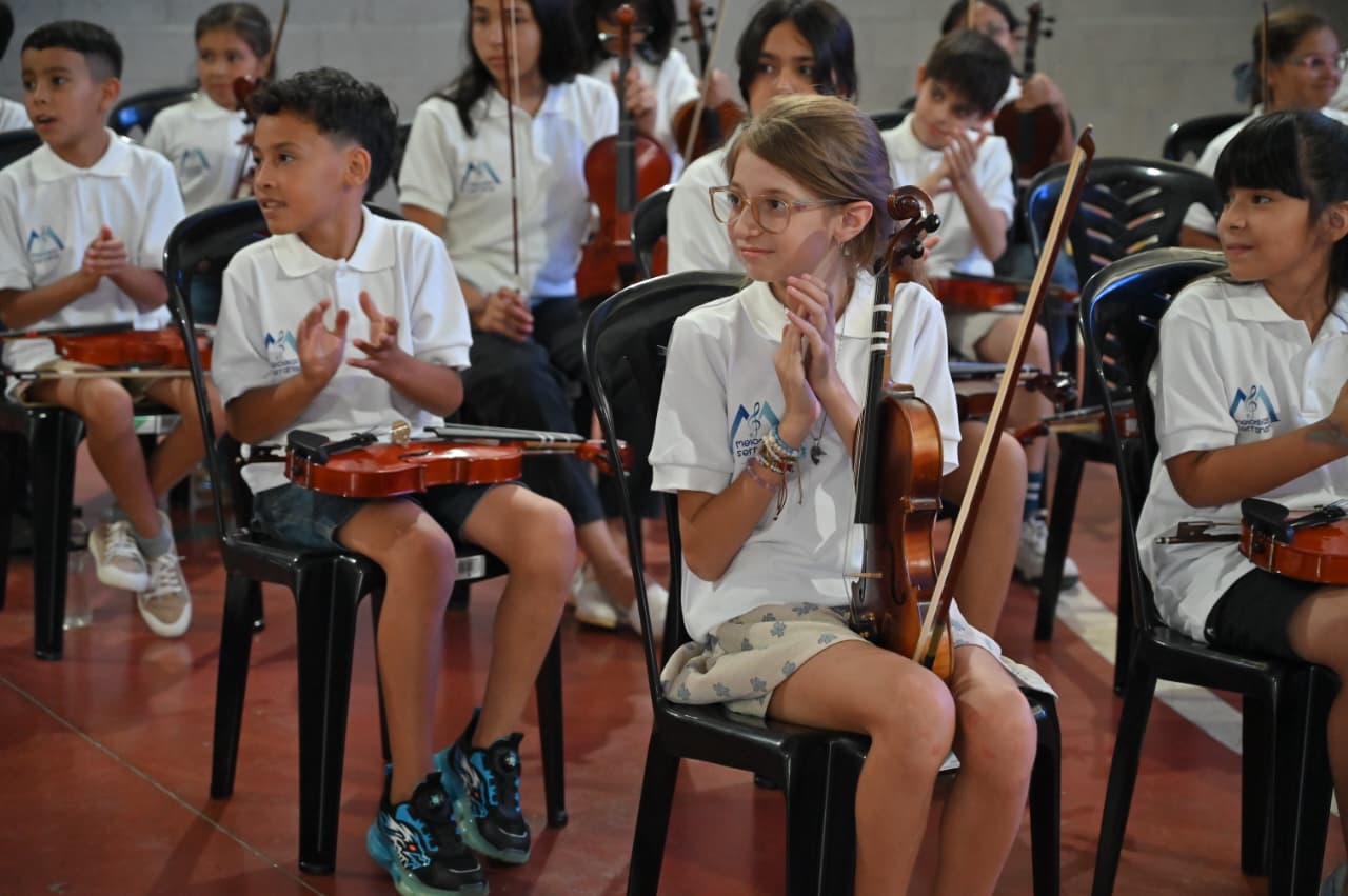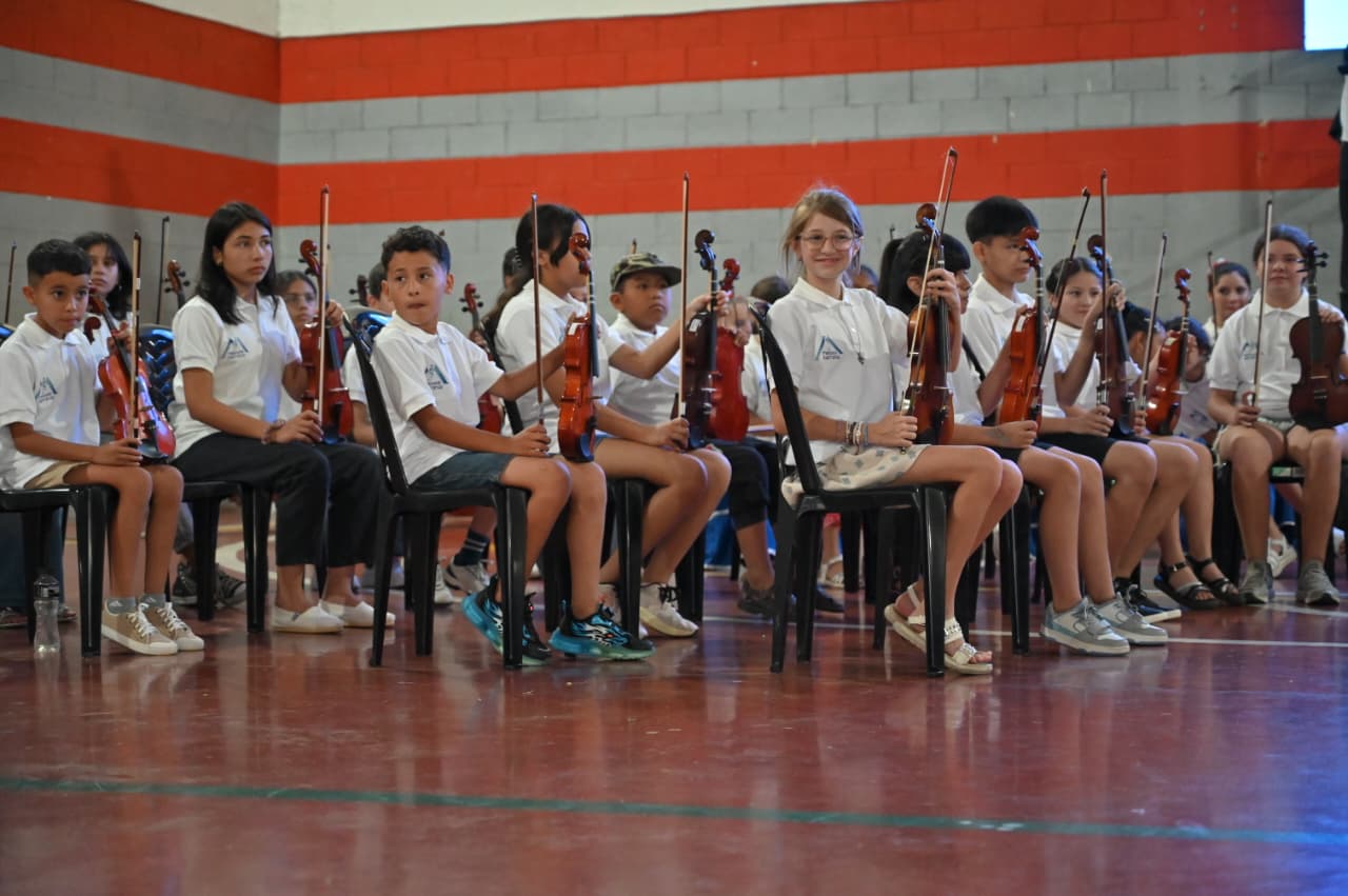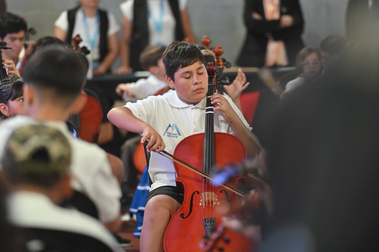 La orquesta infantojuvenil ‘Melodías Serranas’ realizó una presentación especial de fin de año este martes en el Centro N°4 de la Red de Acompañamiento Familiar, ubicado en el corazón del barrio Eva Perón. El grupo está integrado por 60 chicos y chicas, la mayoría de la zona, que forman parte del Sistema de Orquestas que impulsó el Gobierno, con el fin de promover la integración a través de los valores y enseñanzas que se necesitan para integrar un equipo musical.
