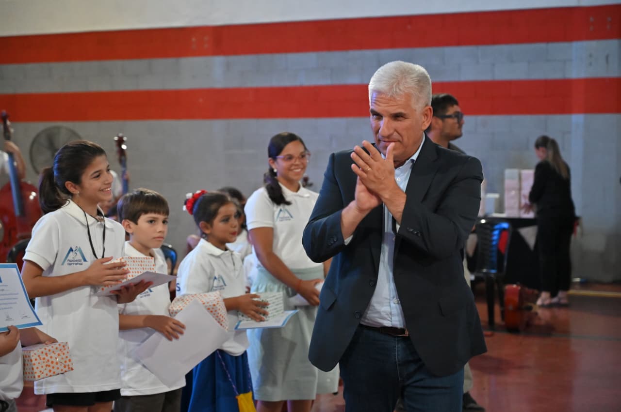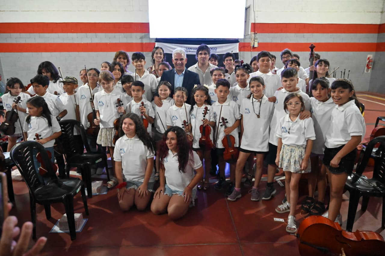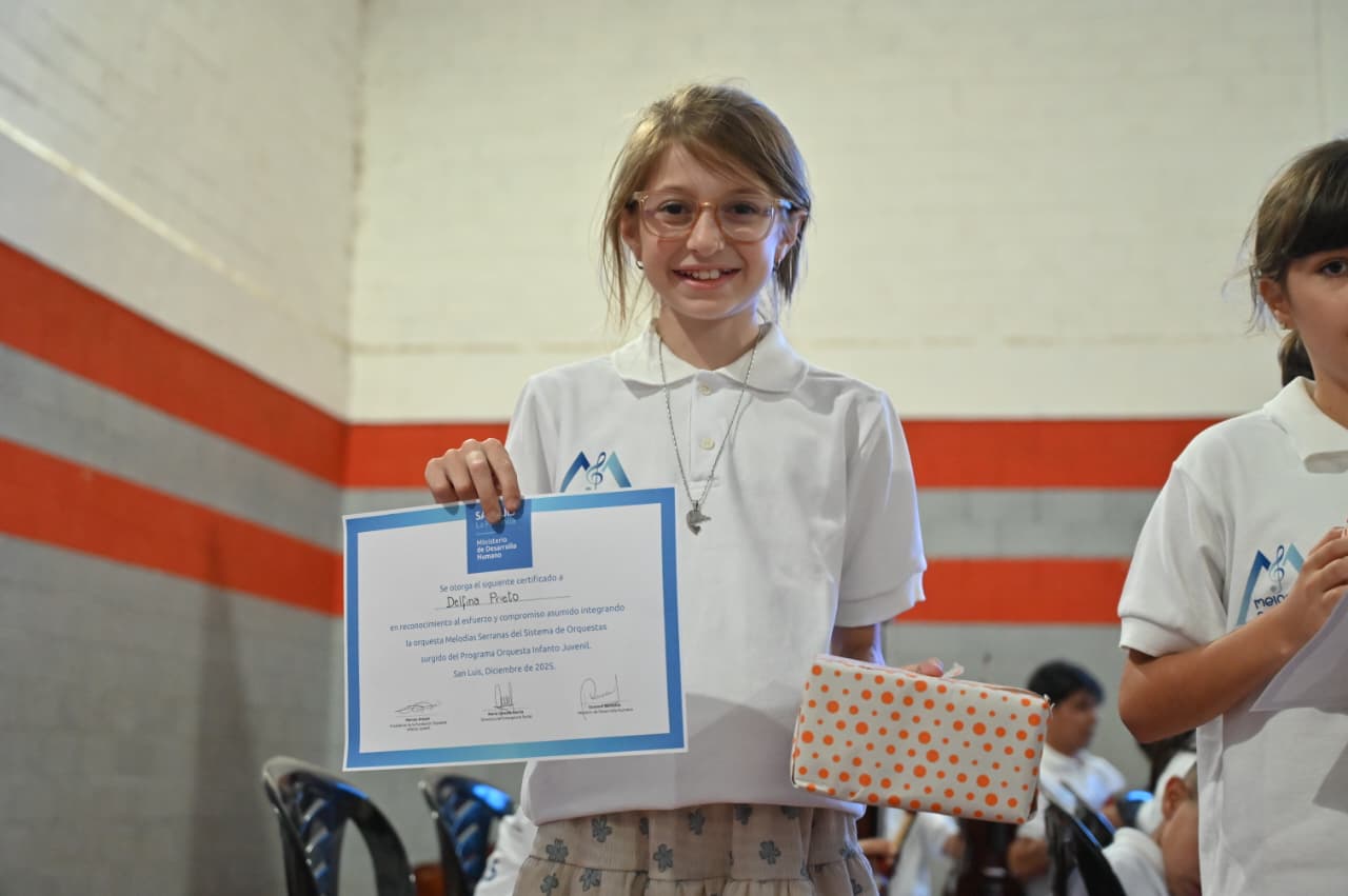 El gobernador Claudio Poggi asistió al evento, que contó con el acompañamiento de la directora de Emergencia Social, Celeste García; el presidente de la Fundación de Orquestas Infantojuveniles, Marcos Arquez y familiares de los músicos. Antes de comenzar con el espectáculo, el Mandatario entregó certificados a cada uno de los chicos, en reconocimiento al esfuerzo, compromiso y trabajo realizado durante el año.