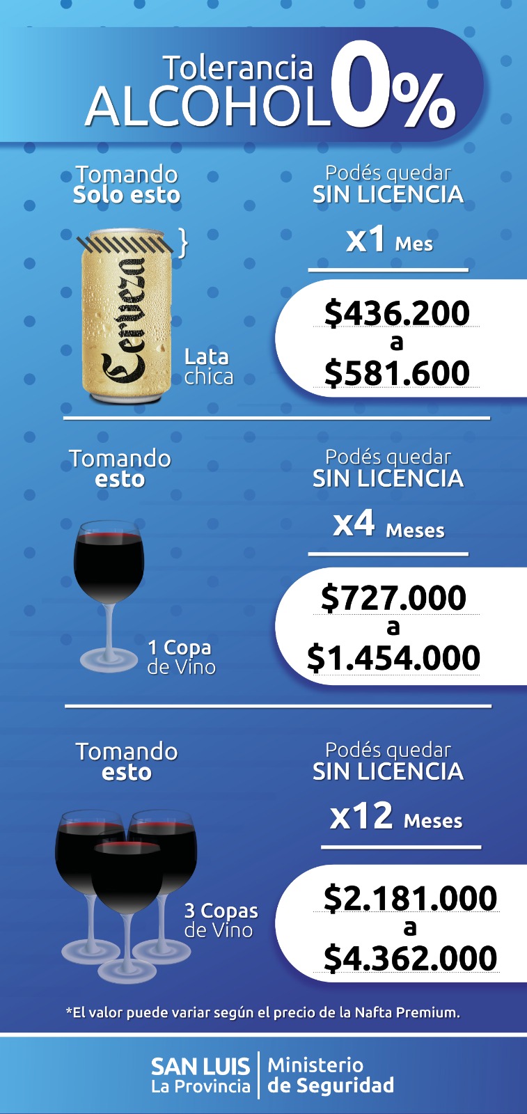 Las autoridades advirtieron que los conductores que arrojen resultado positivo en los controles de alcoholemia estarán expuestos a severas sanciones, con multas que van desde los 436 mil pesos hasta más de 4 millones de pesos, además del secuestro del vehículo y la posible pérdida de la licencia de conducir.