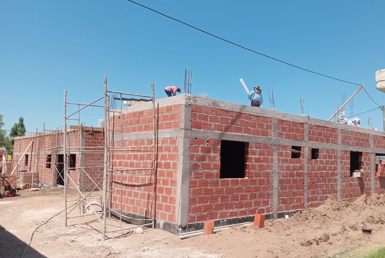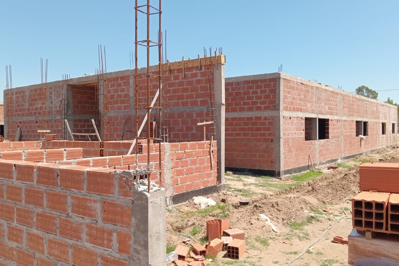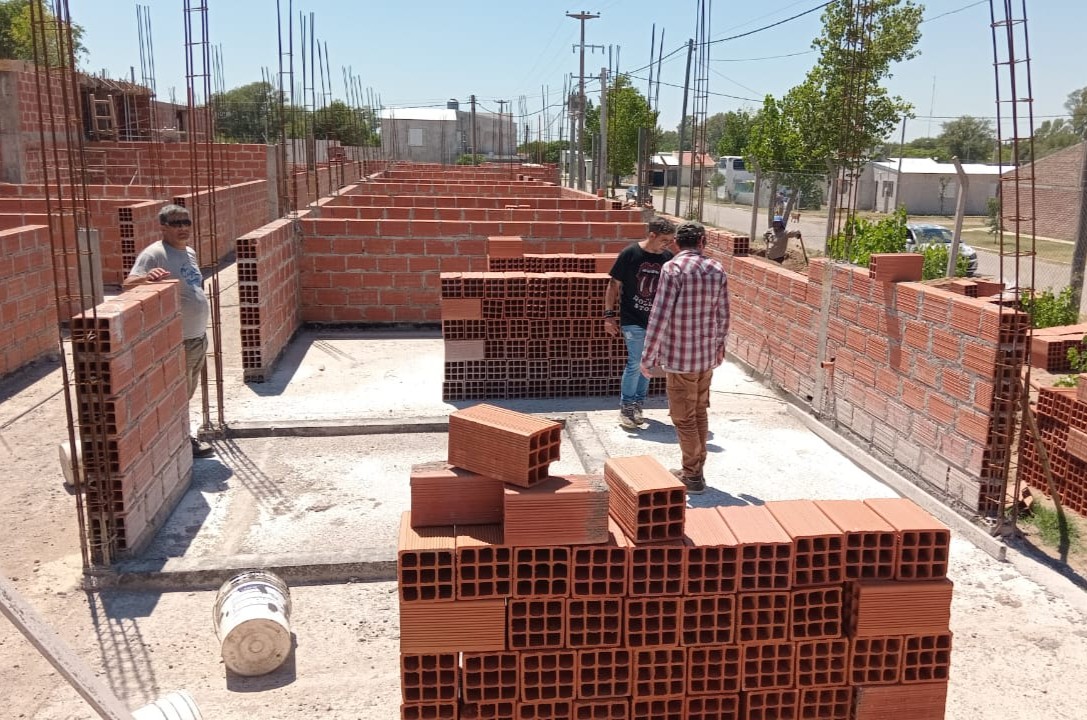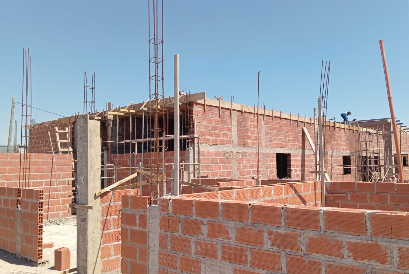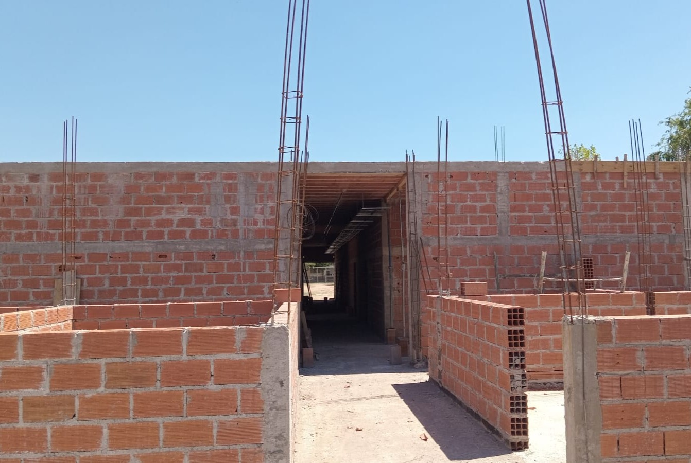 En distintos frentes de obra se avanza con la elevación de mamposterías, con gran parte de los muros perimetrales y divisiones internas ya levantados, lo que permite comenzar a visualizar la futura distribución de los espacios. En otros sectores, continúan las tareas de encofrado y apuntalamiento de losas, previas a nuevas etapas de hormigonado de techos.