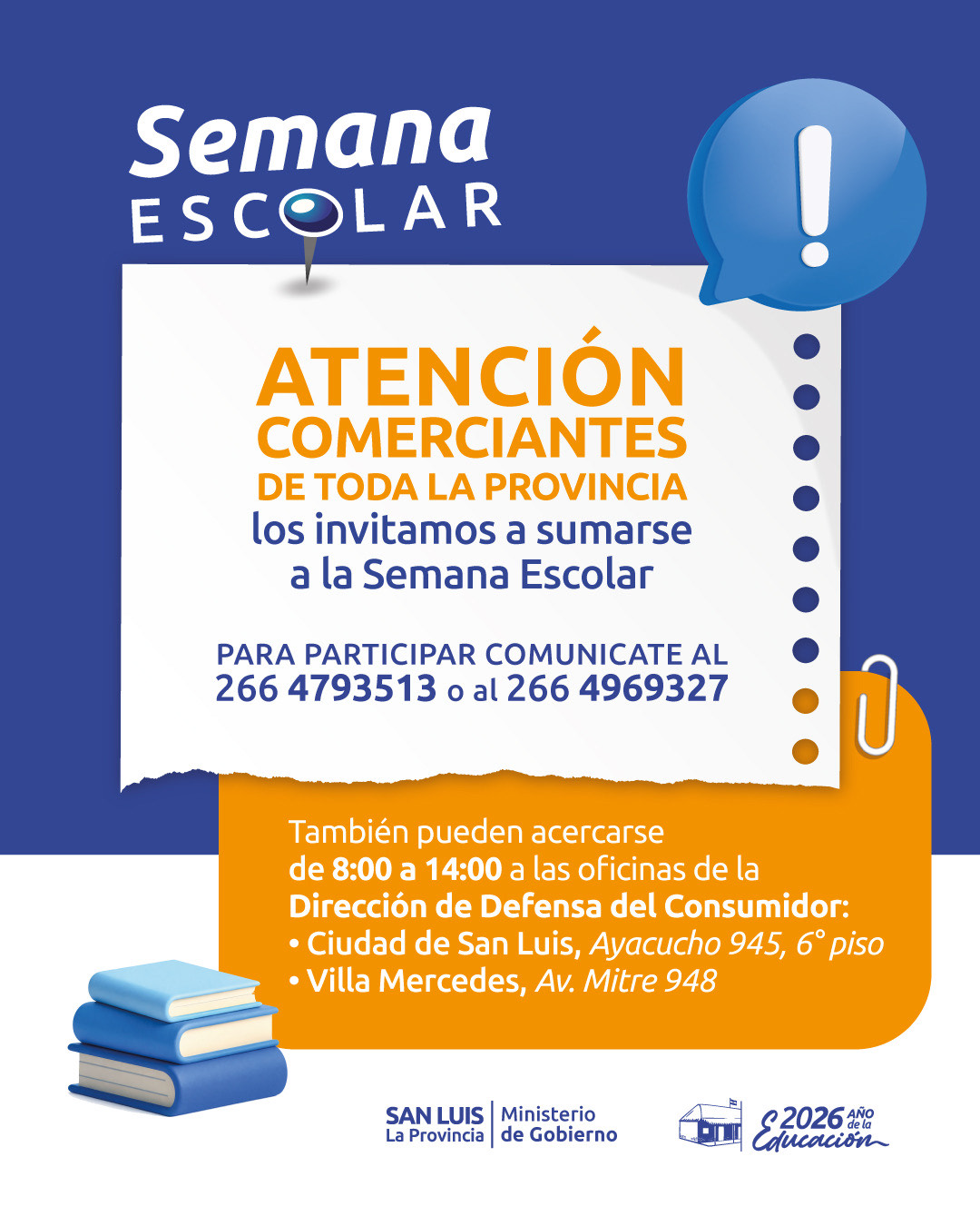 Los comerciantes interesados en sumarse a la Semana Escolar pueden comunicarse al 2664793513 o al 2664969327. También pueden acercarse personalmente a las oficinas de la dirección de Defensa del Consumidor ubicadas en el Edificio Administrativo, Ayacucho 945, sexto piso, en la ciudad de San Luis, o en Avenida Mitre 948 en Villa Mercedes, en horario de 8:00 a 14:00.