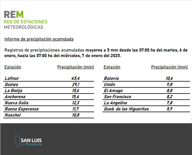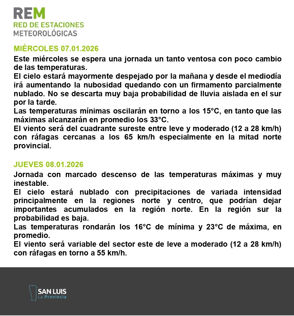 Además, el organismo no descarta una baja probabilidad de lluvias en el sur provincial. En la jornada del martes y madrugada del miércoles, se registraron precipitaciones en Lafinur, Quines, La Botija, Anchorena, Nueva Galia y Buena Esperanza.