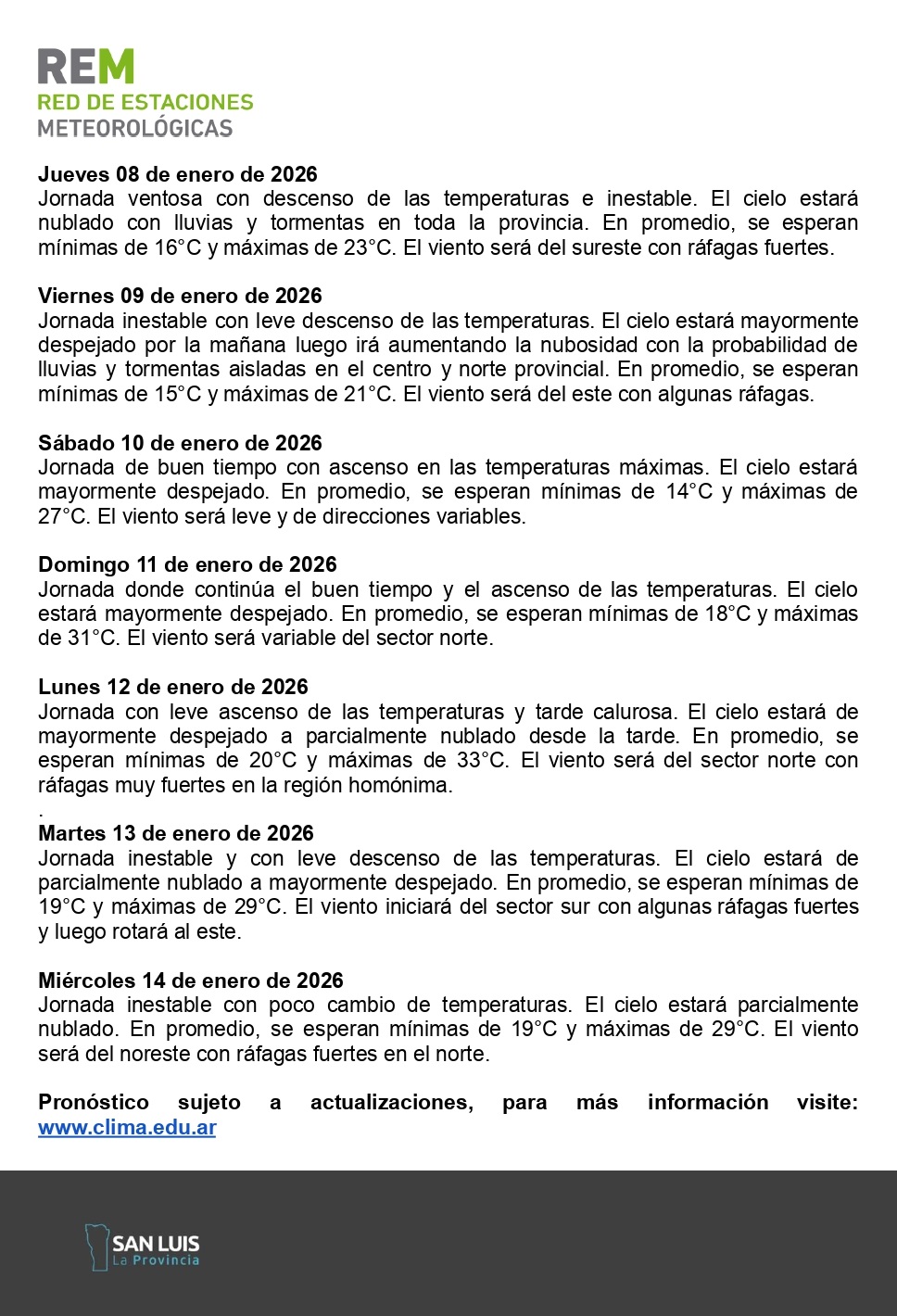 Para el jueves la REM pronostica una jornada inestable y con descenso de temperaturas. El cielo estará nublado con precipitaciones de variada intensidad en las regiones centro y norte de la provincia, que podrían dejar una importante acumulación en la zona. Las temperaturas rondarán los 16°C y una máxima de 23°C en promedio. El viento será del sector este con ráfagas entorno a los 55 kilómetros por hora.