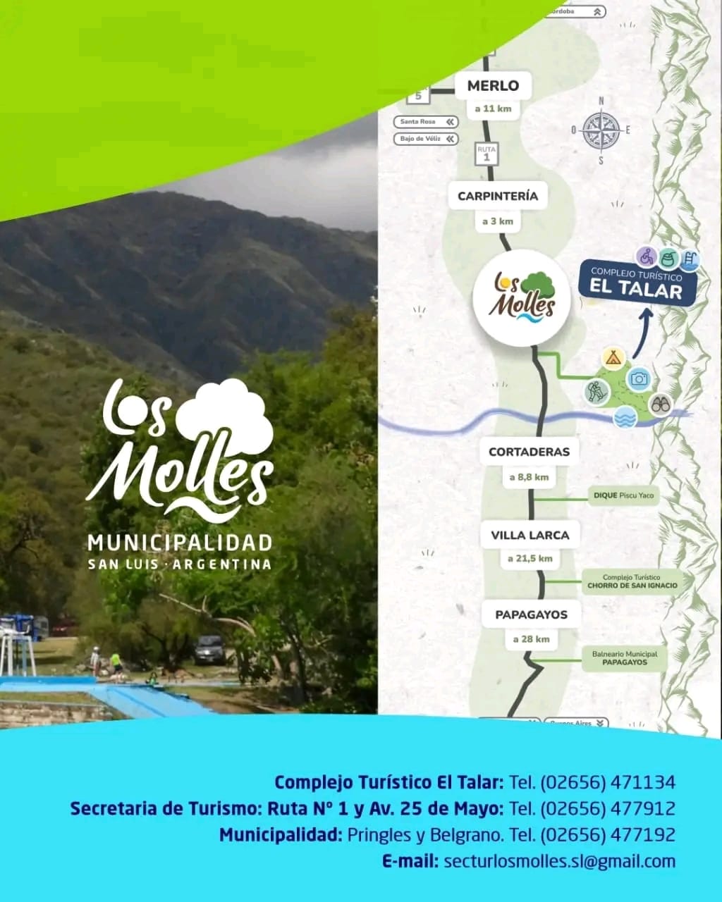 Situado a solo tres kilómetros de la rotonda de acceso a Los Molles, sobre la ruta provincial Nº1, el camping se extiende sobre ocho hectáreas de parque a la vera del arroyo Los Molles, un entorno privilegiado que combina sombras, naturaleza, aire puro, senderos serranos y agua cristalina.