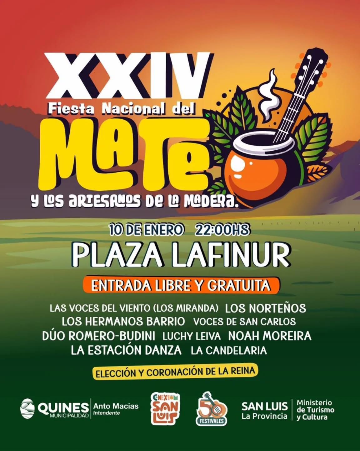 Quines vuelve a rendir homenaje a los productores de la región en la 24° edición de la Fiesta Nacional del Mate y los Artesanos de Madera. La cita del sábado será en la plaza Lafinur, a las 22:00. La entrada es libre y gratuita, de modo que no hay excusas para no asistir.