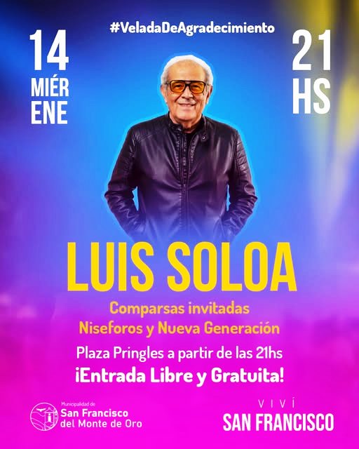 Este miércoles 14 de enero a las 21:00, Luis Soloa compartirá una velada de agradecimiento con vecinos y visitantes de San Francisco del Monte de Oro. Esta propuesta gratuita surge como un gesto del artista hacia su público, que lo ha acompañado durante tantos años de trayectoria. Con un repertorio que recorre sus grandes éxitos, promete una noche inolvidable en la cual la música será el puente que unirá recuerdos y emociones.