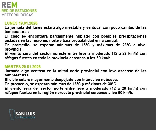 Para este lunes, el Servicio de Estaciones Meteorológicas (REM) anticipó un inicio de semana algo inestable y ventosa, acompañada de poco cambio de las temperaturas. También informaron que el cielo estará parcialmente nublado con posibles precipitaciones aisladas en las regiones norte y baja posibilidad en la central.