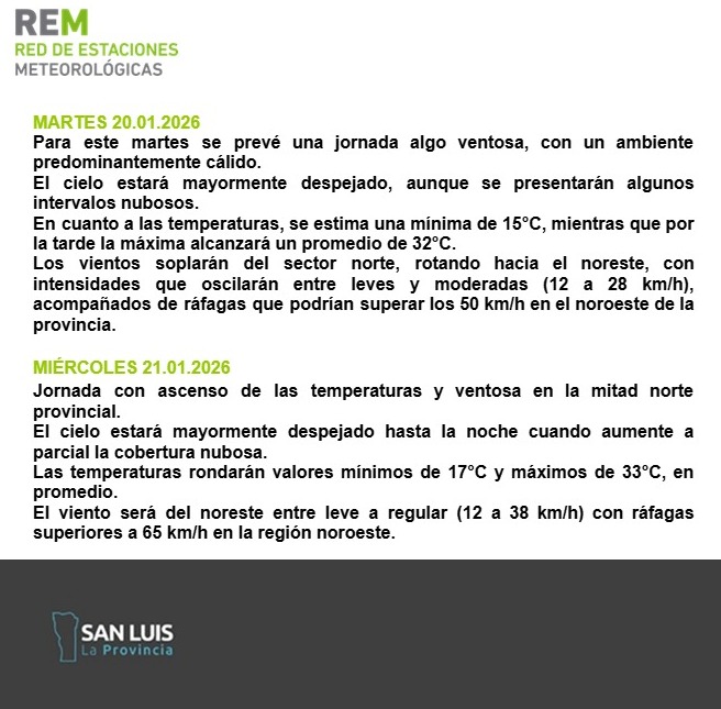 El informe extendido también adelanta que el miércoles habrá un ascenso de las temperaturas y una jornada ventosa para el norte provincial. El cielo estará despejado hasta la noche y las temperaturas rondarán entre 17°C la mínima y máximas de 33°C, en promedio. El viento será del noreste entre leve a regular, con ráfagas superiores a los 65 km por hora en esa región.