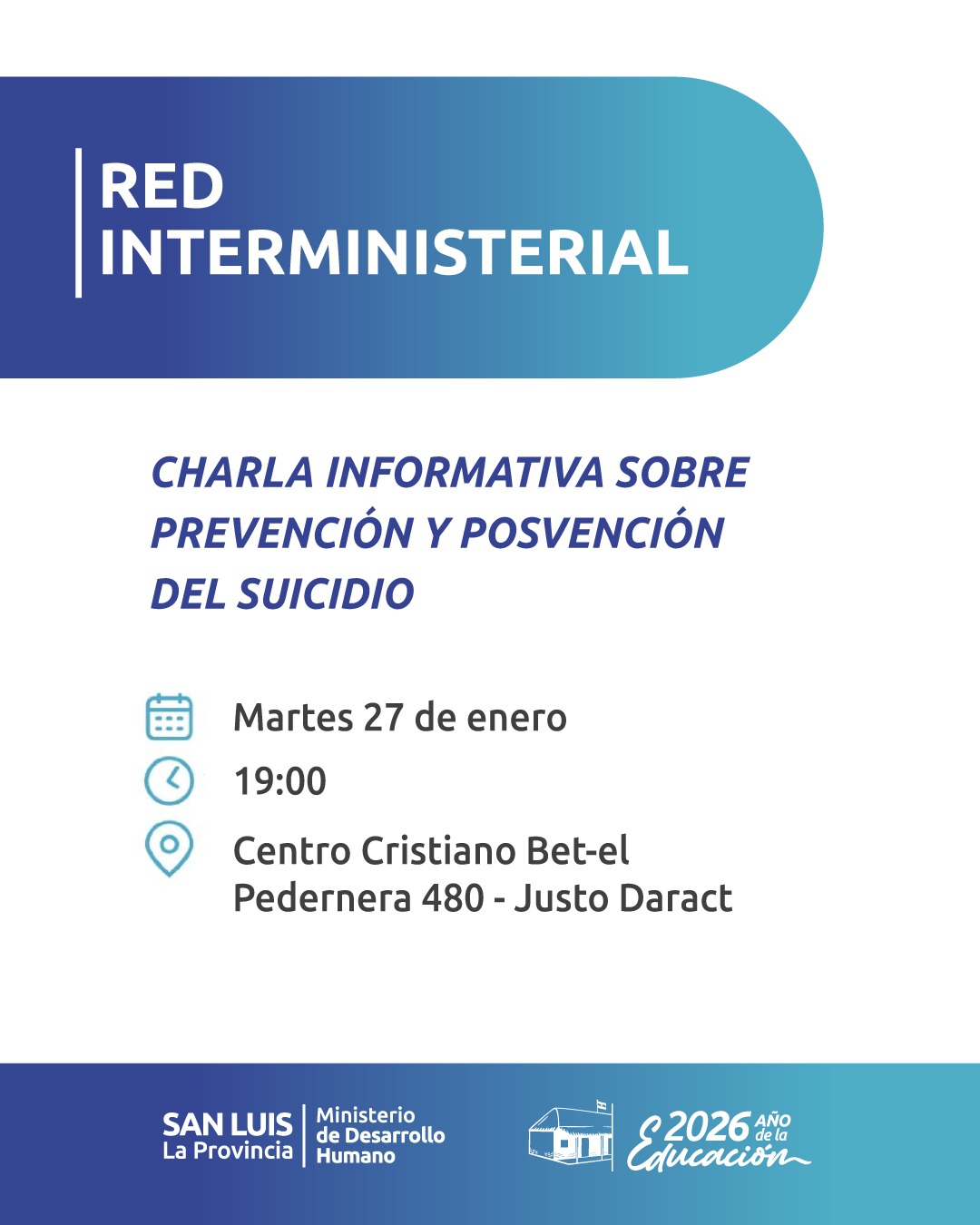 En este sentido, el ministerio de Desarrollo Humano tiene activo desde finales del 2025 un ciclo de charlas que ya llegó a diferentes estamentos de la sociedad. El próximo martes, 27 de enero, tendrá epicentro en la ciudad de Justo Daract. La responsable del ciclo, Celeste García, informó que se realizará a las 19:00 en el Centro Cristiano Bet-el ubicado en Pedernera 480 y agregó que la actividad es gratuita y abierta a toda la comunidad.