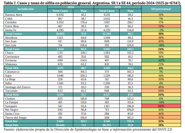 En 2025, los indicadores más altos de sífilis a nivel nacional se registraron en Córdoba (210,7 casos cada 100.000 habitantes), Neuquén (196,8) y Tierra del Fuego (187,3), que encabezaron el ranking por incidencia y explicaron una parte relevante del aumento observado a nivel país.