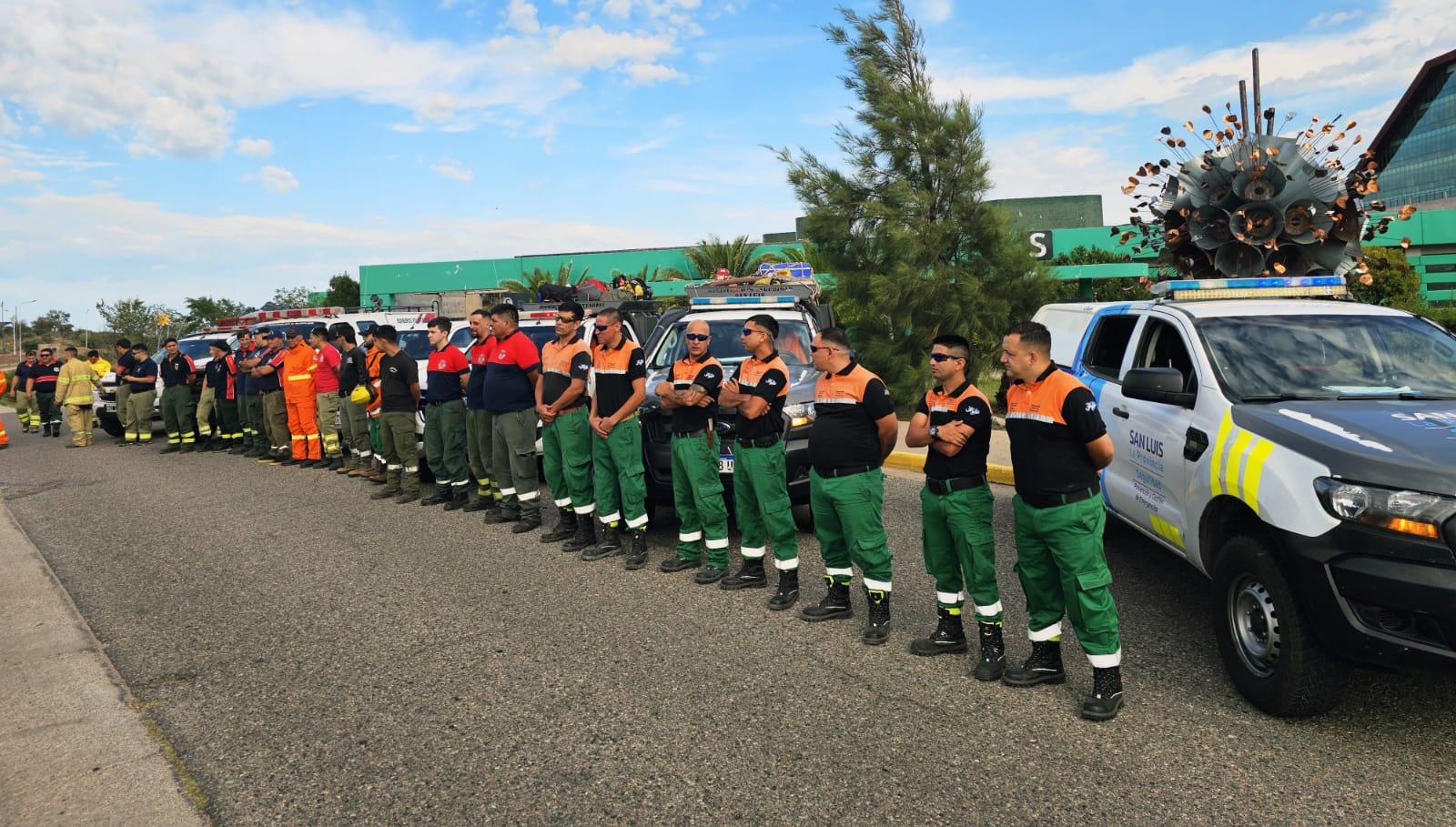 Minutos antes de que el equipo abandonara el punto concentración, Gustavo Albornoz, director de Prevención y Gestión de Emergencia, detalló que todo el personal viaja con “sus elementos de protección de seguridad, con todos los elementos operativos para el combate”, y precisó que el operativo sanluiseño está compuesto por “8 brigadistas y 2 camionetas de nuestra dirección del Ministerio de Seguridad, más 5 camionetas del Sistema de Bomberos Voluntarios y 22 efectivos de ellos”.