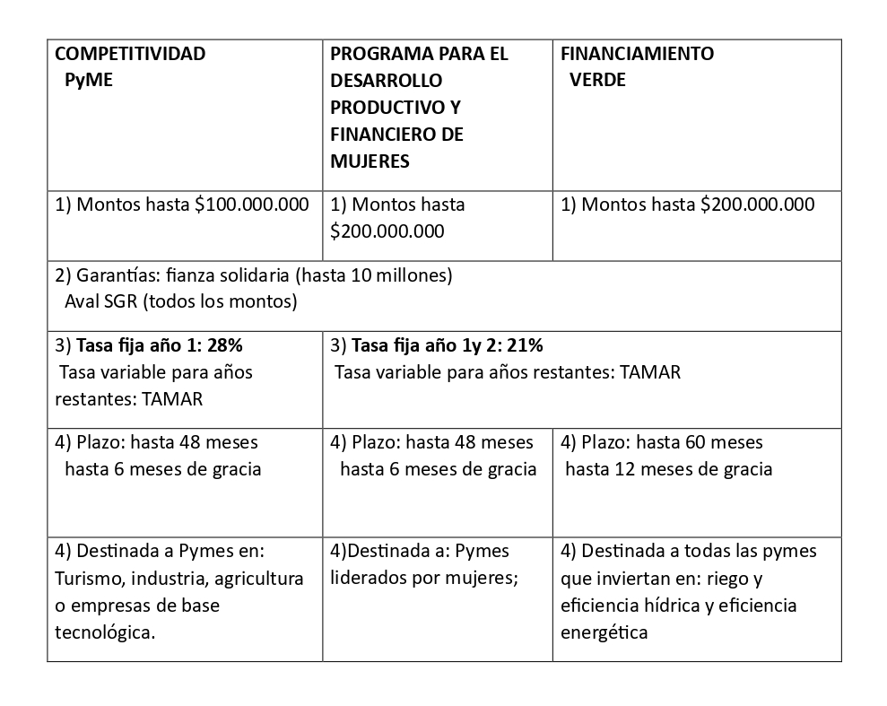 La línea de Competitividad PyME está destinada a empresas de los sectores turismo, industria, agricultura y base tecnológica, con montos de hasta 100 millones de pesos, plazos de hasta 48 meses y períodos de gracia de hasta seis meses. Por su parte, el Programa para el Desarrollo Productivo y Financiero de Mujeres contempla financiamiento de hasta 200 millones de pesos, con el mismo plazo y tasa preferencial, orientado a pymes lideradas por mujeres.