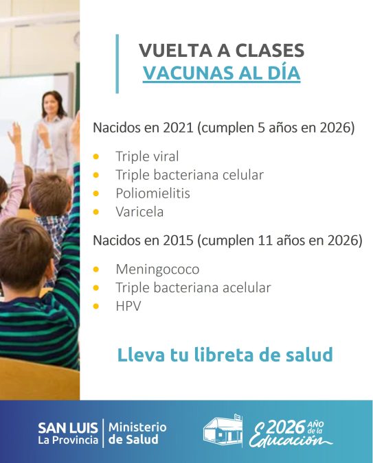 El próximo 23 de febrero, los chicos de San Luis inician el ciclo lectivo. El Ministerio de Salud recuerda a madres y padres la importancia de que los niños regresen a la escuela con el Calendario Nacional de Vacunación completo y actualizado. Es una medida clave para prevenir enfermedades.
