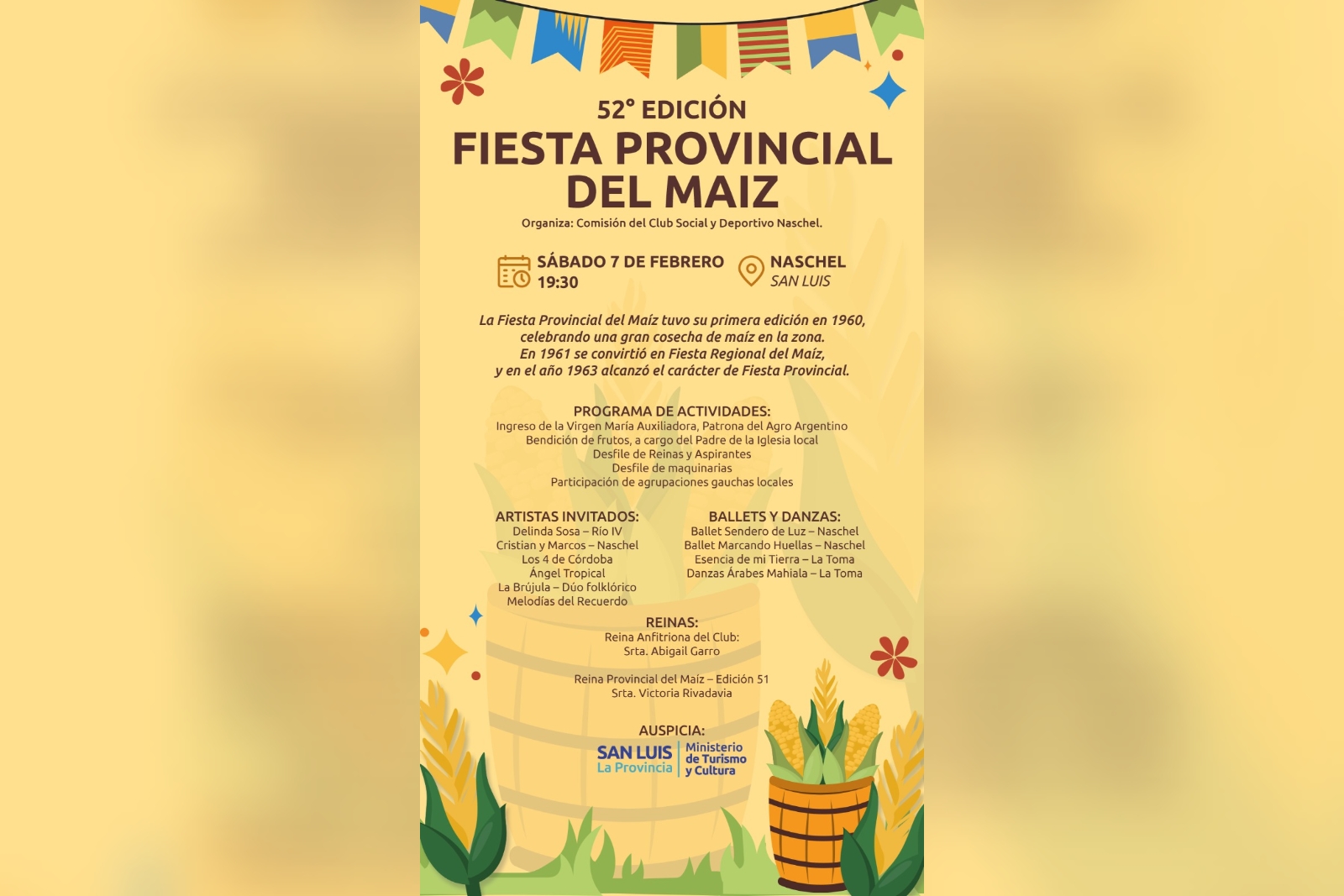 Continúa la grilla de festivales a lo largo de toda la provincia. Naschel, que tuvo un exitoso festejo por su aniversario días atrás, nuevamente ofrecerá un encuentro que englobará fiesta, tradición y alegría comunitaria. Se trata de la edición N°52 de la Fiesta Provincial del Maíz, cuya organización es impulsada por el Club Social y Deportivo de la localidad.