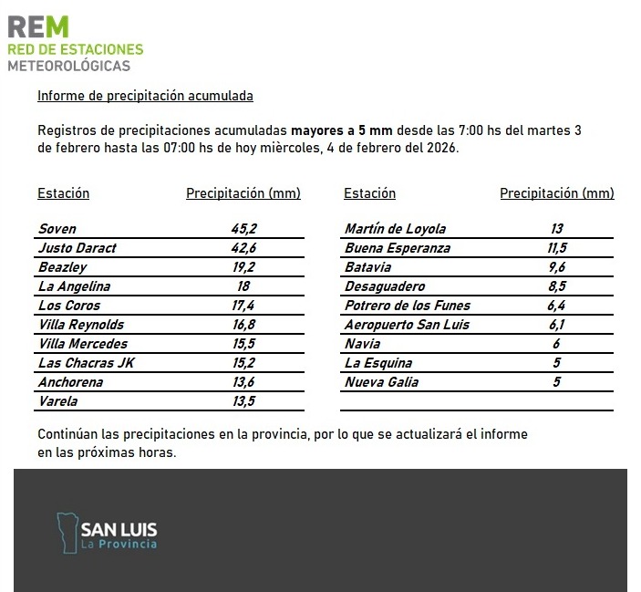 En las últimas 24 horas se registró abundantes lluvias en distintas regiones de la provincia. Soven con 45,2 mm y Justo Daract con 42,6 mm fueron las localidades que encabezaron el informe.