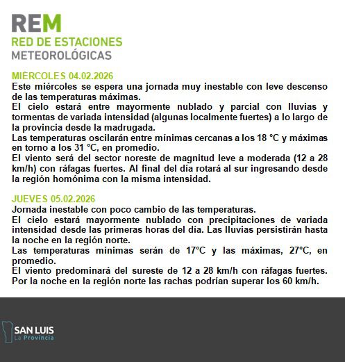 La Red de Estaciones Meteorológicas (REM) informó que San Luis atravesará dos jornadas marcadas por la inestabilidad, con abundante nubosidad, lluvias y tormentas de variada intensidad, además de un leve descenso de las temperaturas máximas.