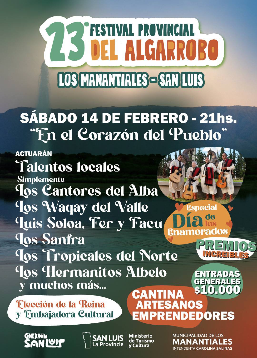 “Quiero agradecer a Turismo y Cultura por el acompañamiento, no solamente económico sino también en cuanto a la difusión, como así también al Gobernador. El festival comenzará a las 21:00 en la calle más importante de nuestra localidad, porque es la más ancha, al frente de la plaza, en el corazón del pueblo. Nuestra grilla está compuesta por una parte folclórica y por una parte bailable a cargo de bandas provinciales y una banda nacional, Los Cantores Alba“, dijo la intendenta de Los Manantiales, Carolina Salinas.