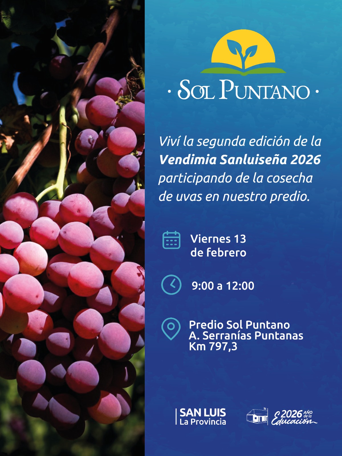 El próximo viernes 13 se llevará adelante la segunda edición de la Vendimia Sanluiseña en el predio de Sol Puntano. La actividad se desarrollará de 9:00 a 12:00 y estará orientada a productores, trabajadores del sector y público interesado en la producción vitivinícola.