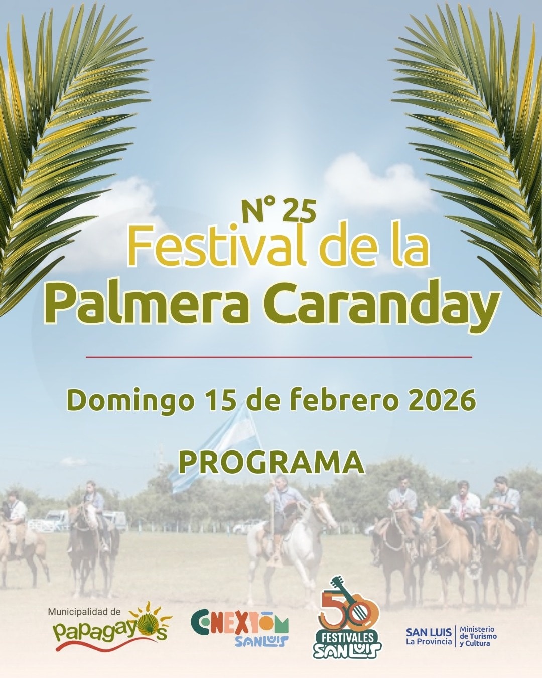 Papagayos vuelve a ser anfitriona en 2026, para recibir a turistas de la provincia y el país en la 25ª edición del Festival de la Palmera Caranday, el domingo 15 de febrero. El intendente de la localidad, José Luis Gauna, dio detalles este martes, en conferencia de prensa, de lo que ofrecerá este tradicional encuentro que rinde homenaje a lo autóctono, simbolizado con la especie arbórea que embellece esta región de San Luis. “La palmera caranday hace a la identidad en nuestra localidad”, destacó Gauna.