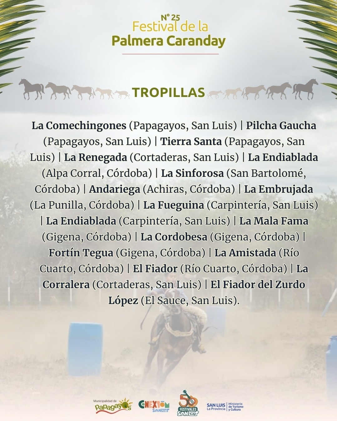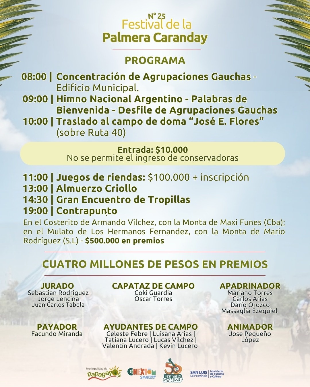 “Agradecemos al ministerio de Cultura y Turismo, al Gobierno de la provincia. Cumplimos 25 años del Festival de la Palmera Caranday, que es organizado por la agrupación gaucha ‘Los Amigos’, que propuso este festival y fiscaliza, junto con la Municipalidad”, dijo.