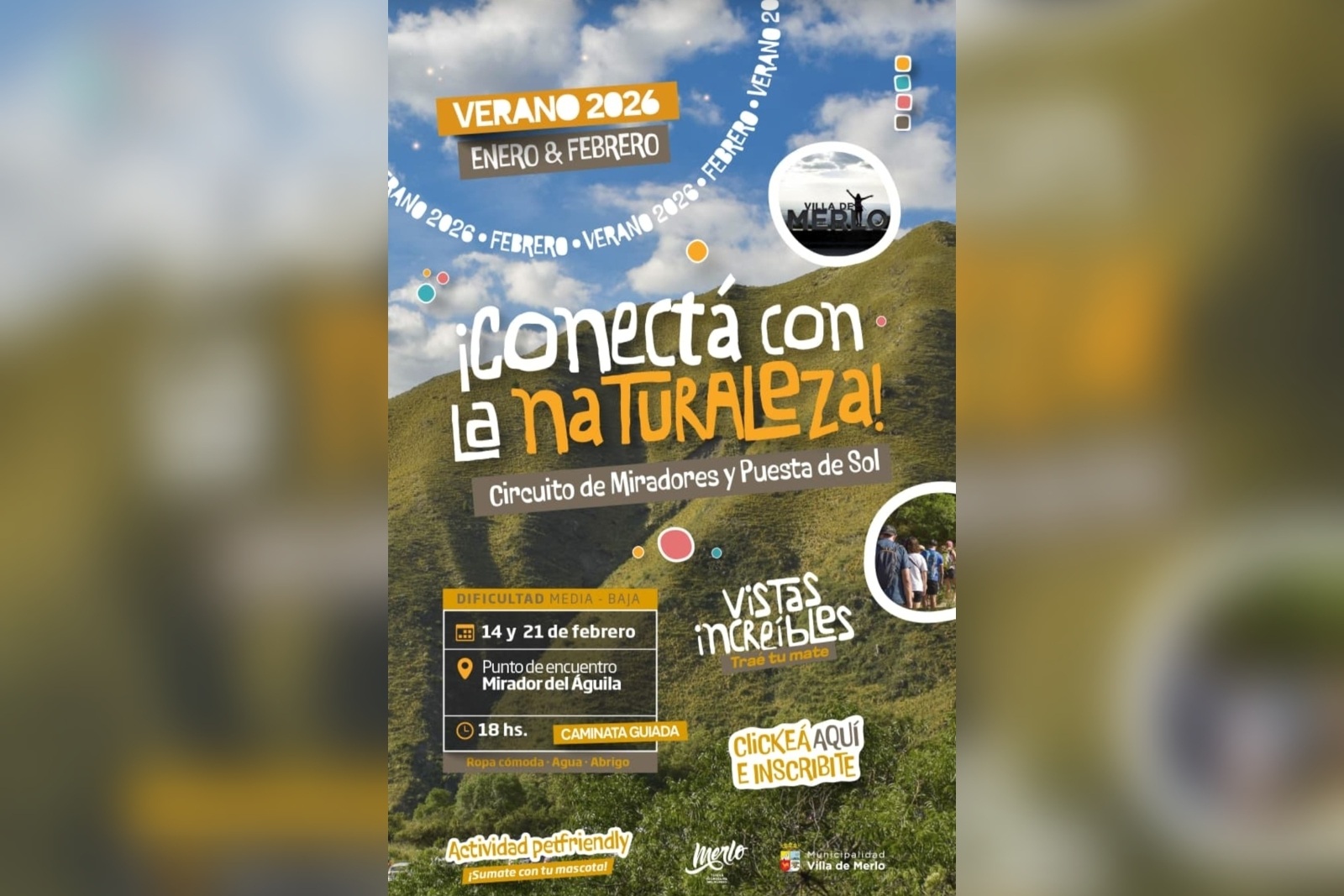 En esta oportunidad, la secretaría de Turismo local invita a participar de la actividad ‘Conectá con la naturaleza: Circuito de Miradores y Puesta de Sol’, una caminata guiada de dificultad baja-media que propone recorrer senderos naturales y miradores, disfrutando de vistas panorámicas y del atardecer en las inigualables sierras merlinas.
