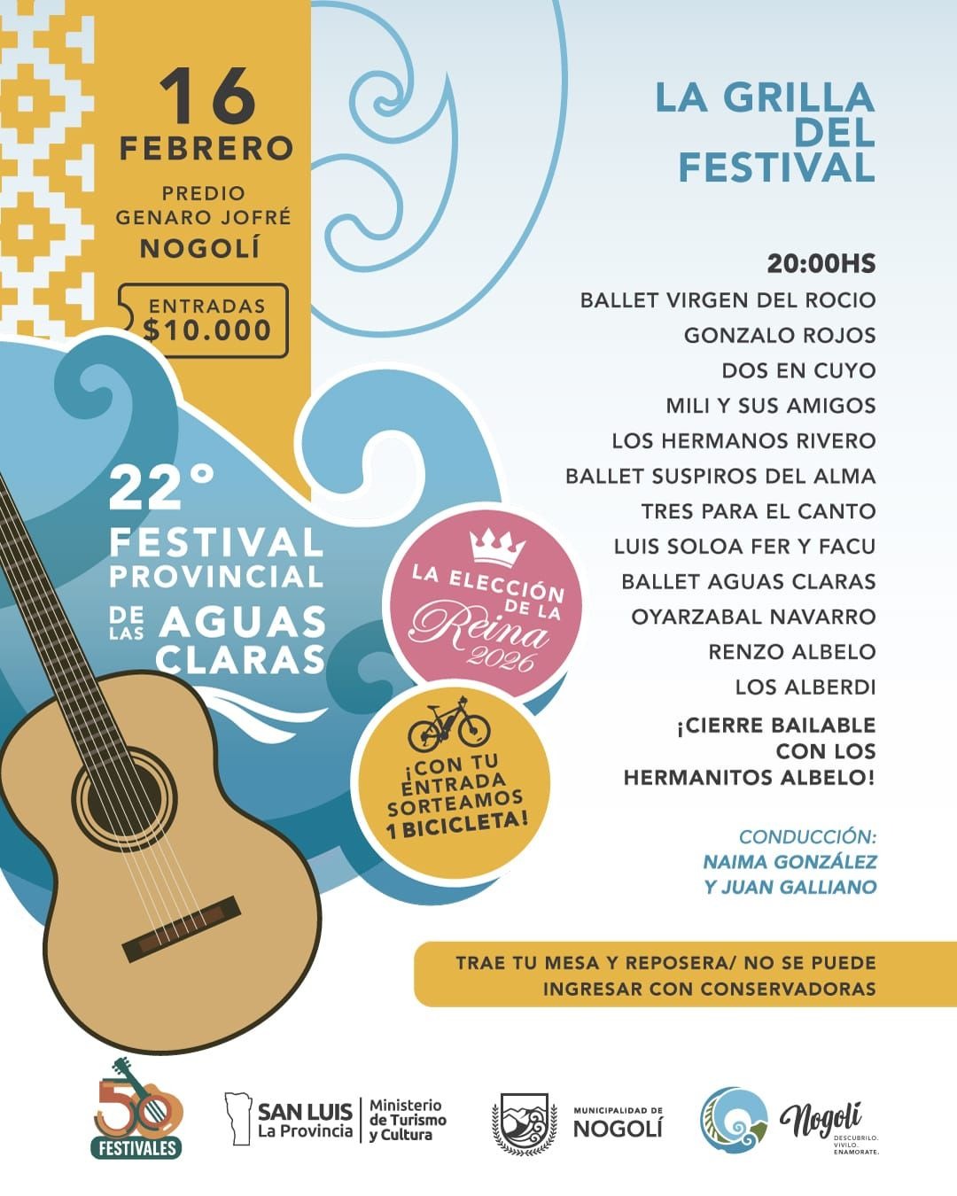 La 22° edición del Festival Provincial de las Aguas Claras se desarrollará el lunes 16 en el predio Genaro Jofré, en Nogolí. La entrada tiene un valor de $10 mil y con el ticket participan del sorteo de una bicicleta. Desde la municipalidad autorizaron el uso de reposeras y mesas, pero no el de conservadoras.