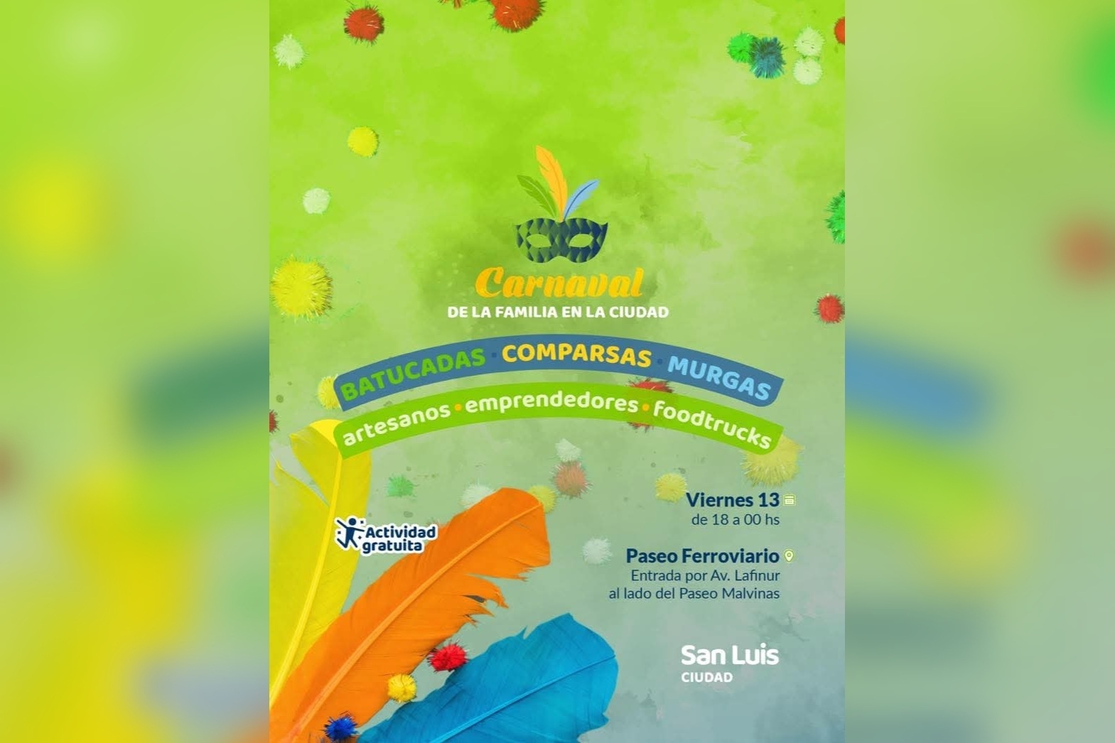 Llega el esperado ‘Carnaval de la Familia’ a la ciudad de San Luis. Con la combinación perfecta de música, brillo, color, el evento promete un espacio de encuentro para las familias locales. Tendrá lugar este viernes, a partir de las 18:00, en el Paseo Ferroviario (ingreso por Av. Lafinur, al lado del Paseo Malvinas). La entrada será libre y gratuita.