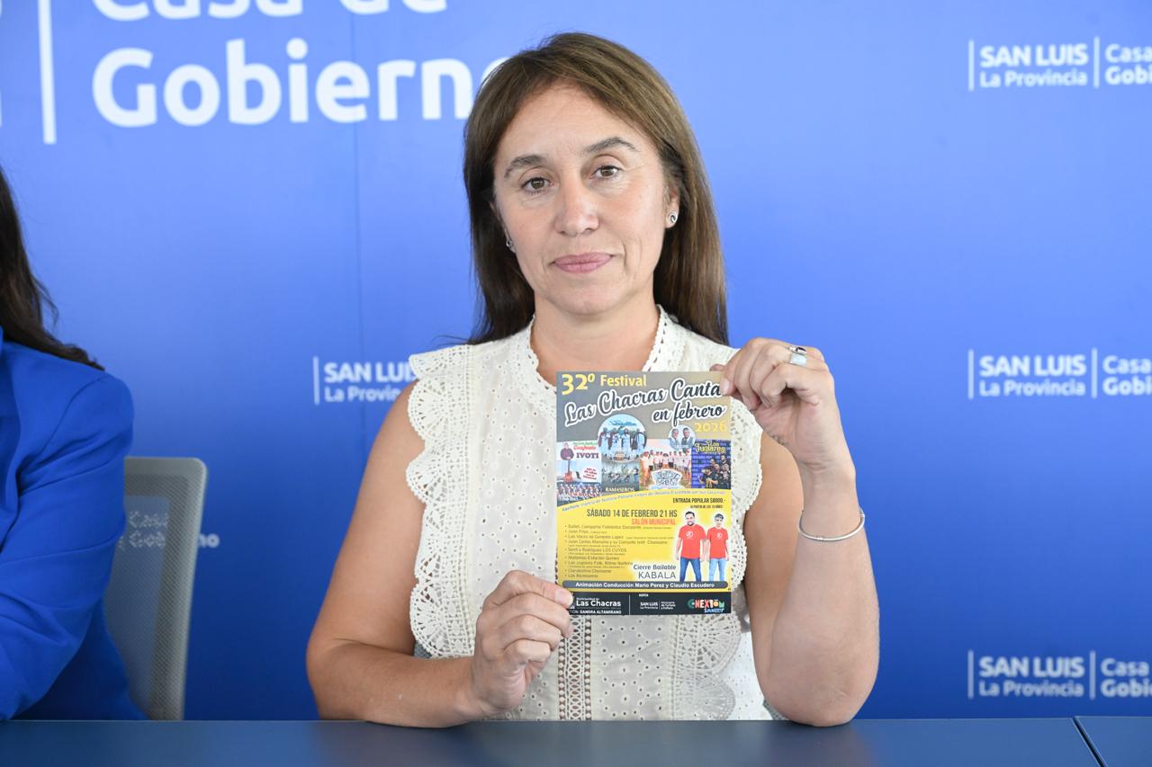 La intendenta de Las Chacras, Sandra Altamirano, encabezó este jueves una conferencia de prensa en Casa de Gobierno para invitar a la comunidad a participar de la 32ª edición del festival ‘Las Chacras Canta en Febrero’, que se realizará este sábado 14 desde las 21:00 en la localidad ubicada en el departamento San Martín.