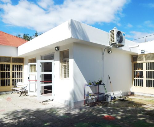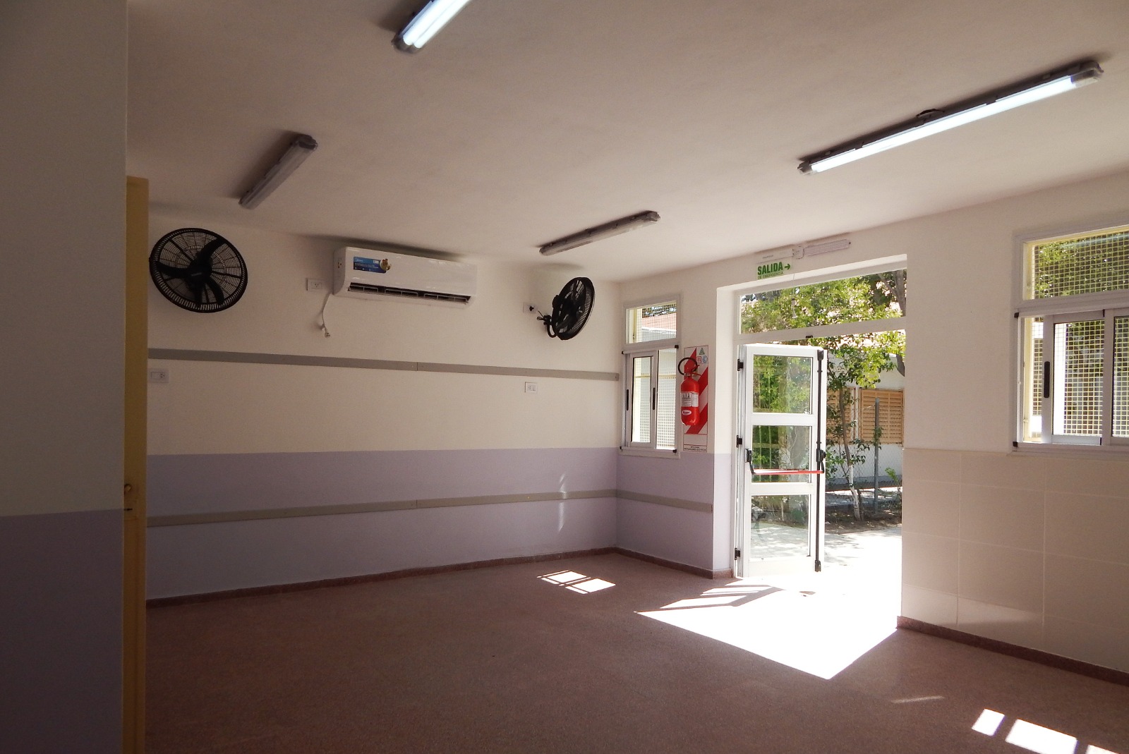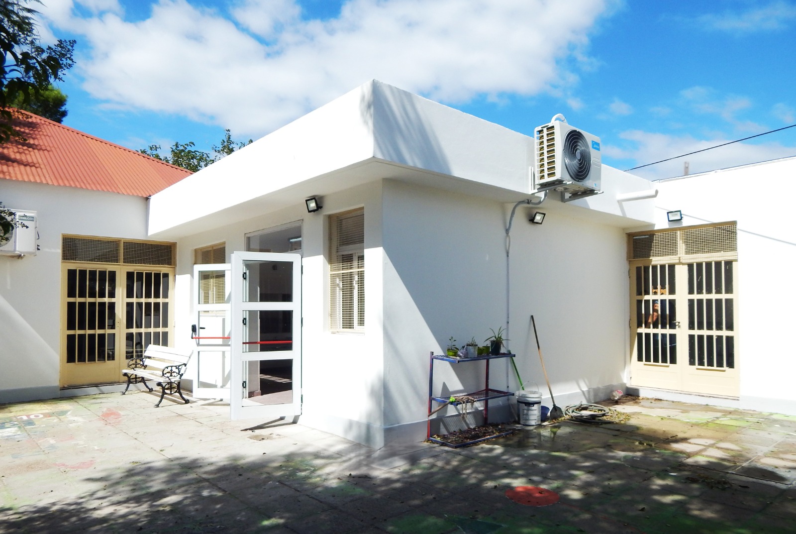 Desde el patio interno puede apreciarse la obra concluida en su exterior: revoques y pintura terminados, aberturas colocadas y sistema de climatización instalado. La conexión directa con el patio garantiza un acceso cómodo y seguro, pensado especialmente para la dinámica cotidiana del nivel Inicial.