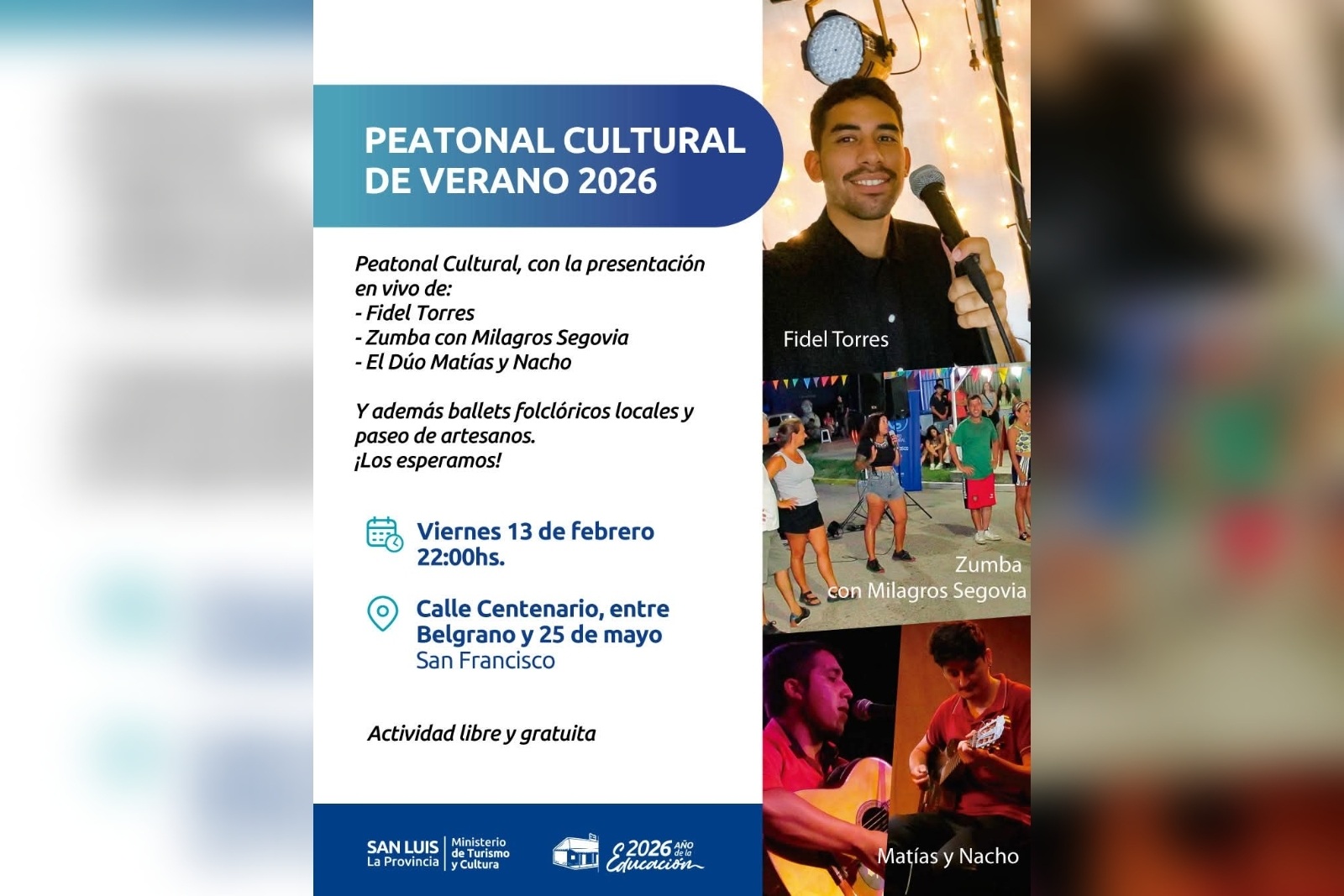 Este ciclo se posiciona como una novedosa apuesta cultural y turística de la temporada 2026 en la localidad cabecera del departamento Ayacucho. La propuesta se viene desarrollando todos los viernes en la cuadra donde está situado el Centro Cultural. La programación semanal incluye una amplia agenda de espectáculos y actividades para toda la familia.