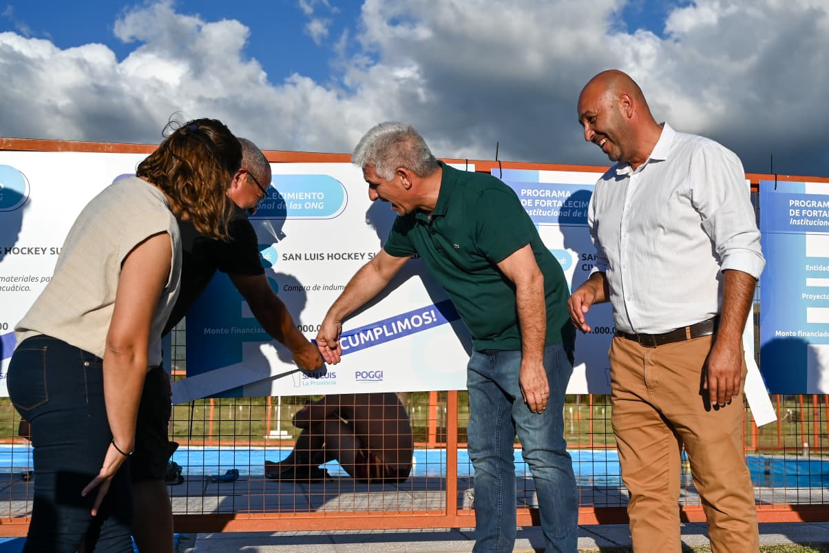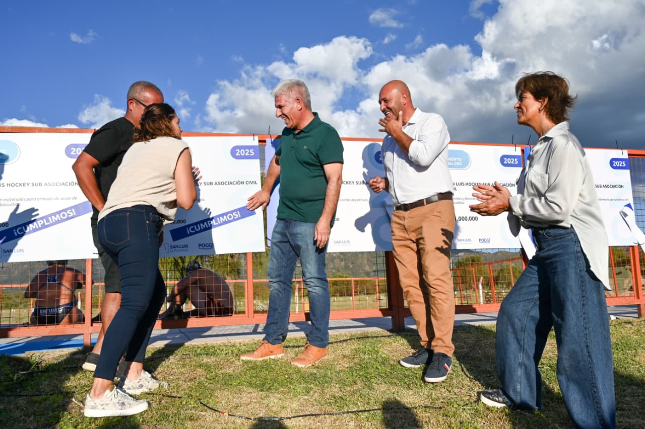 ‘San Luis Hockey Sub’ es una de las primeras asociaciones en recibir seis aportes económicos de parte del programa. Este sábado, Poggi, Romero, Ayala y Lorena Domínguez (directora de Personería Jurídica) pusieron la calcomanía de cumplido a cuatro de ellos.