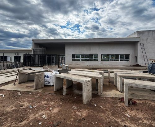 En el exterior, el establecimiento exhibe su volumetría definitiva, con revoques prácticamente concluidos y accesos claramente definidos. En paralelo, avanzan en la colocación de cerramientos perimetrales, rejas en aberturas y divisiones entre patios interiores, además de la instalación de carpinterías. En los patios y áreas comunes trabajan en el acondicionamiento del terreno y en la disposición de mobiliario urbano, al tiempo que ultiman detalles constructivos en galerías y espacios semicubiertos.