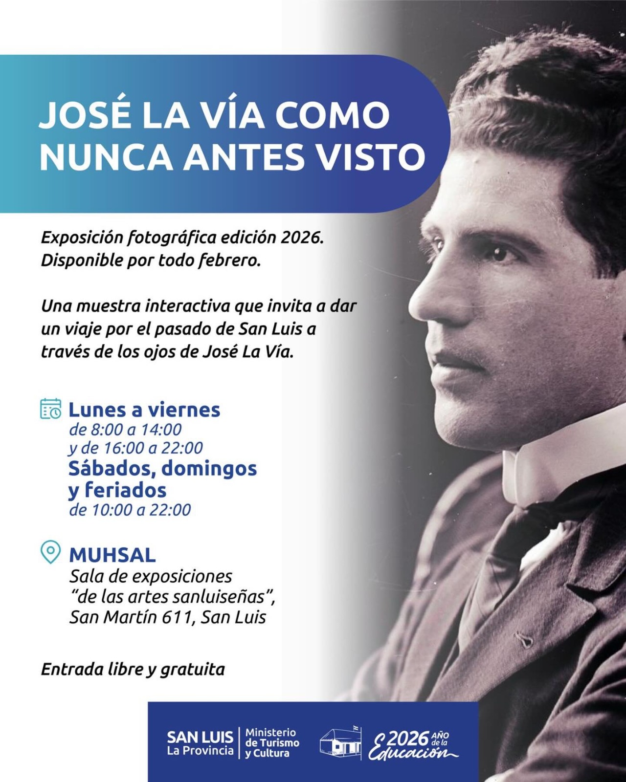 Exposición fotográfica edición 2026, una muestra interactiva que invita a dar un viaje por el pasado de San Luis a través de los ojos de José La Vía en el Museo de Historia de San Luis, con estrada libre y gratuita. Se puede visitar de lunes a viernes, de 8:00 a 14:00 y de 16:00 a 22:00, y los sábados, domingos y feriados, de 10:00 a 22:00.
