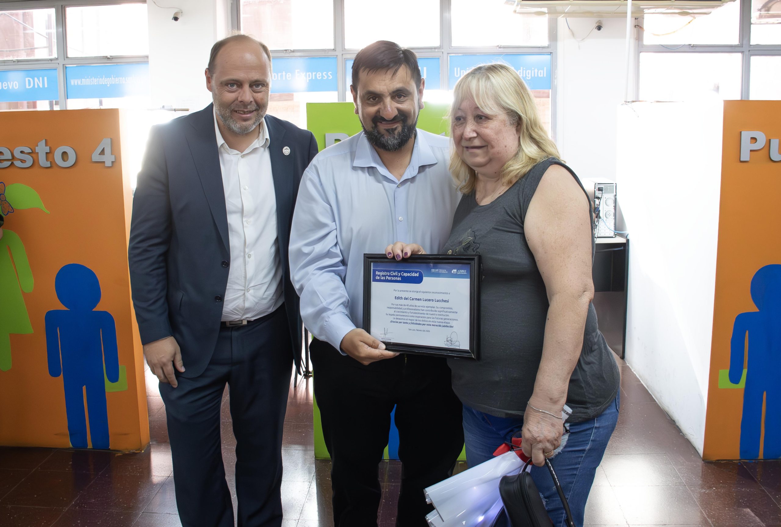 Luego de décadas de esfuerzo y dedicación puestas en la labor diaria en la oficina gubernamental, Edith tuvo una despedida a la que se sumaron el ministro de Gobierno, Gonzalo Amondarain, y el director del Registro, Guillermo Valdevenitez.