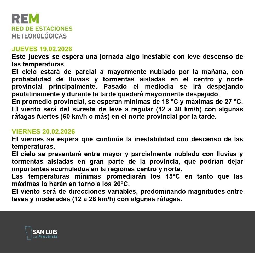 La Red de Estaciones Meteorológicas (REM) anticipó para este jueves una jornada inestable con la posibilidad de precipitaciones en el centro y norte de la provincia, con máximas que no superarán los 27°C. Para el viernes no habrá cambios en las temperaturas y continuarán las lluvias.