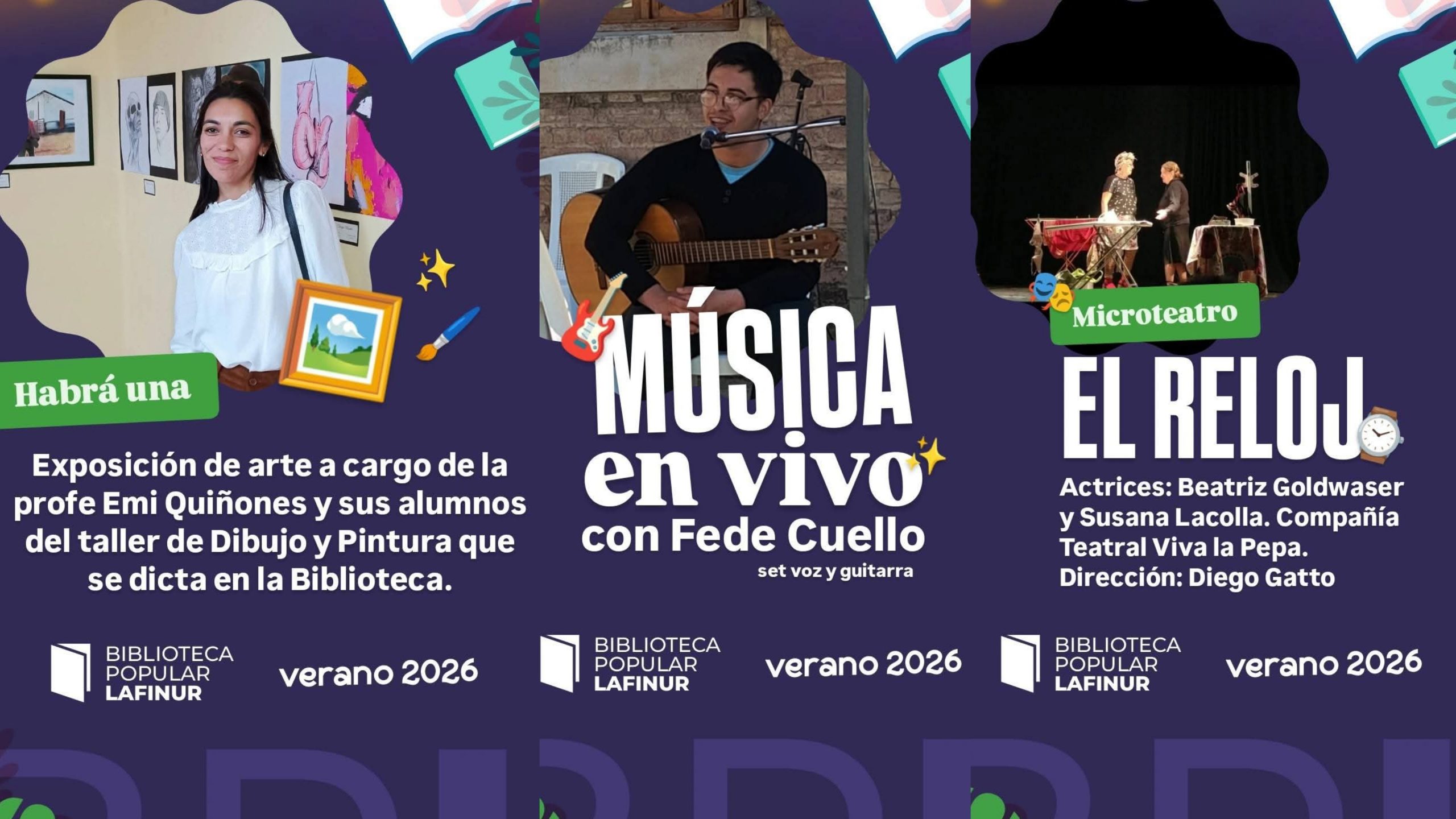 En cuanto a las propuestas culturales, por un lado habrá una exposición de arte a cargo de la profesora Emi Quiñones y sus alumnos del Taller de Dibujo y Pintura que se dicta en las instalaciones de la biblioteca. También, habrá un show musical en vivo con Fede Cuello en guitarra y voz. Asimismo, se presentará una función de la pieza de microteatro ‘El reloj’ con las actrices Beatriz Goldwaser y Susana Lacolla de la compañía teatral ‘Viva la pepa’ con dirección de Diego Gatto.