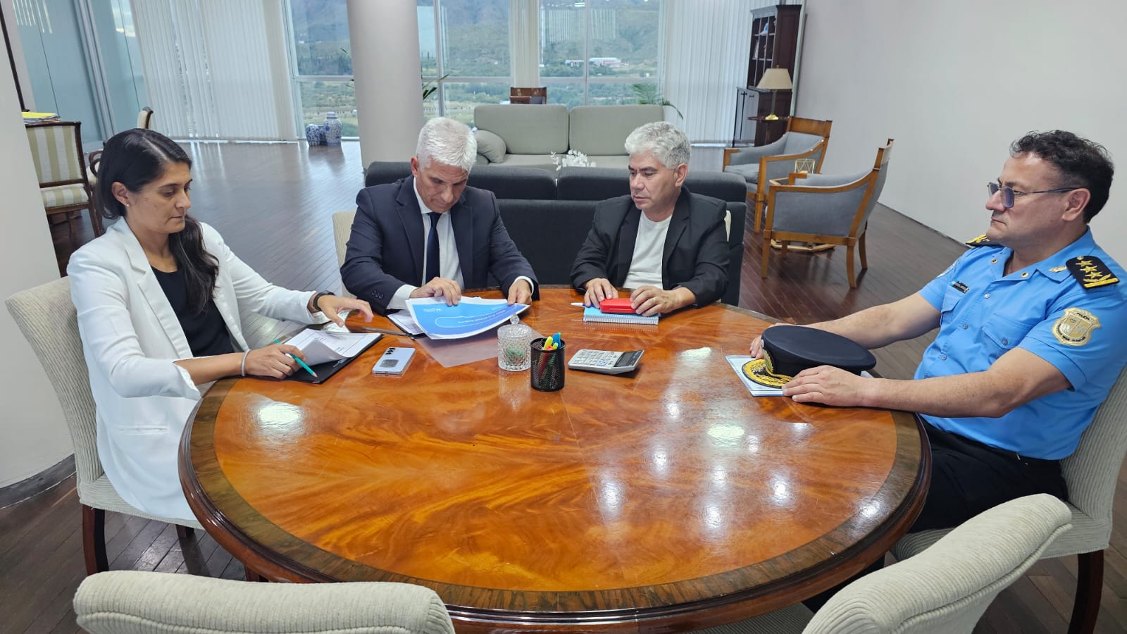 Este viernes por la tarde, el gobernador Claudio Poggi recibió este viernes en su despacho a la ministro de Seguridad, Nancy Sosa, al jefe de la Policía, Juan Carlos Serrano, y al subjefe Néstor Miranda, quienes le presentaron el Plan de Ruralidad Segura, una iniciativa que busca fortalecer las capacidades policiales en materia de prevención y control del delito en el ámbito rural.