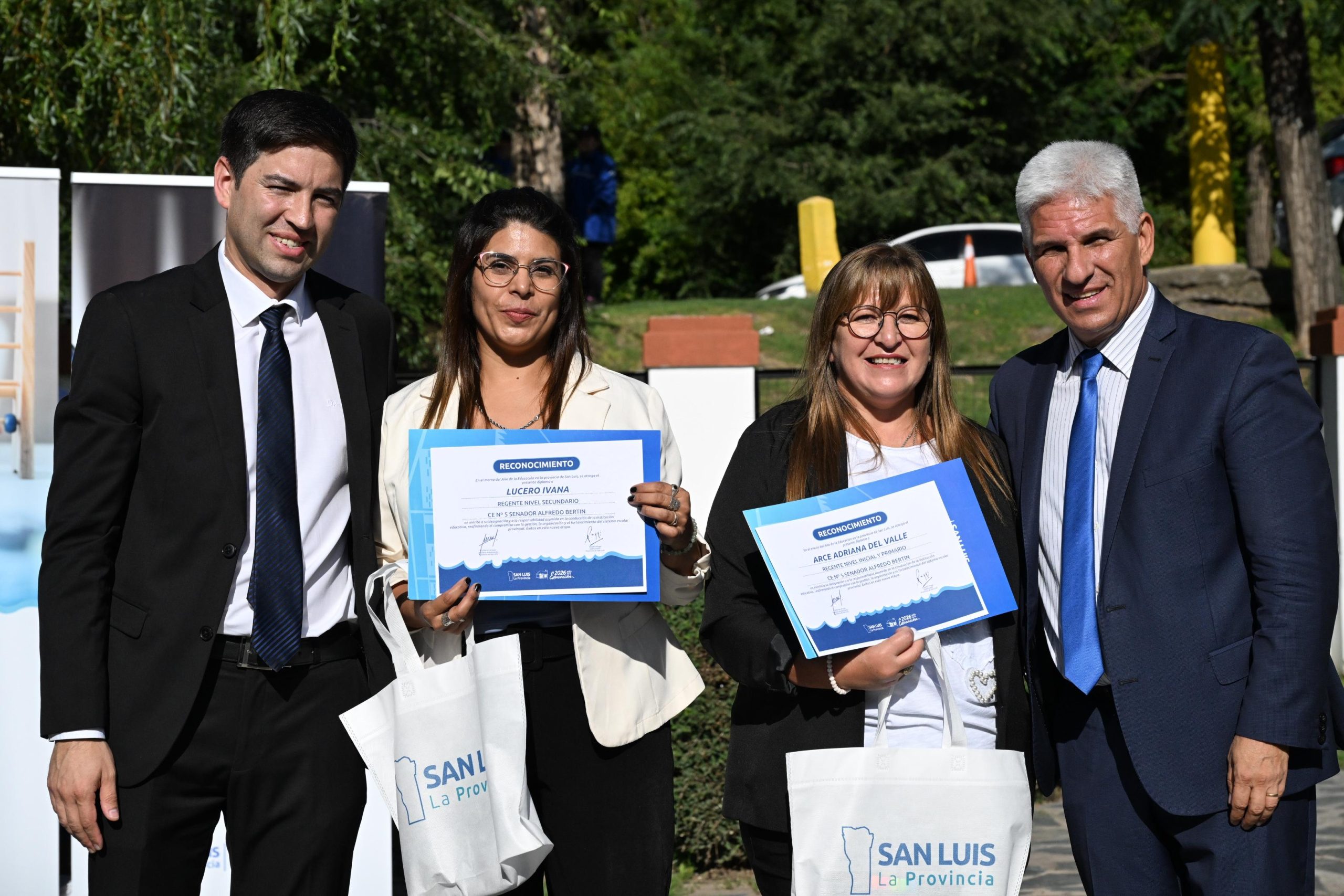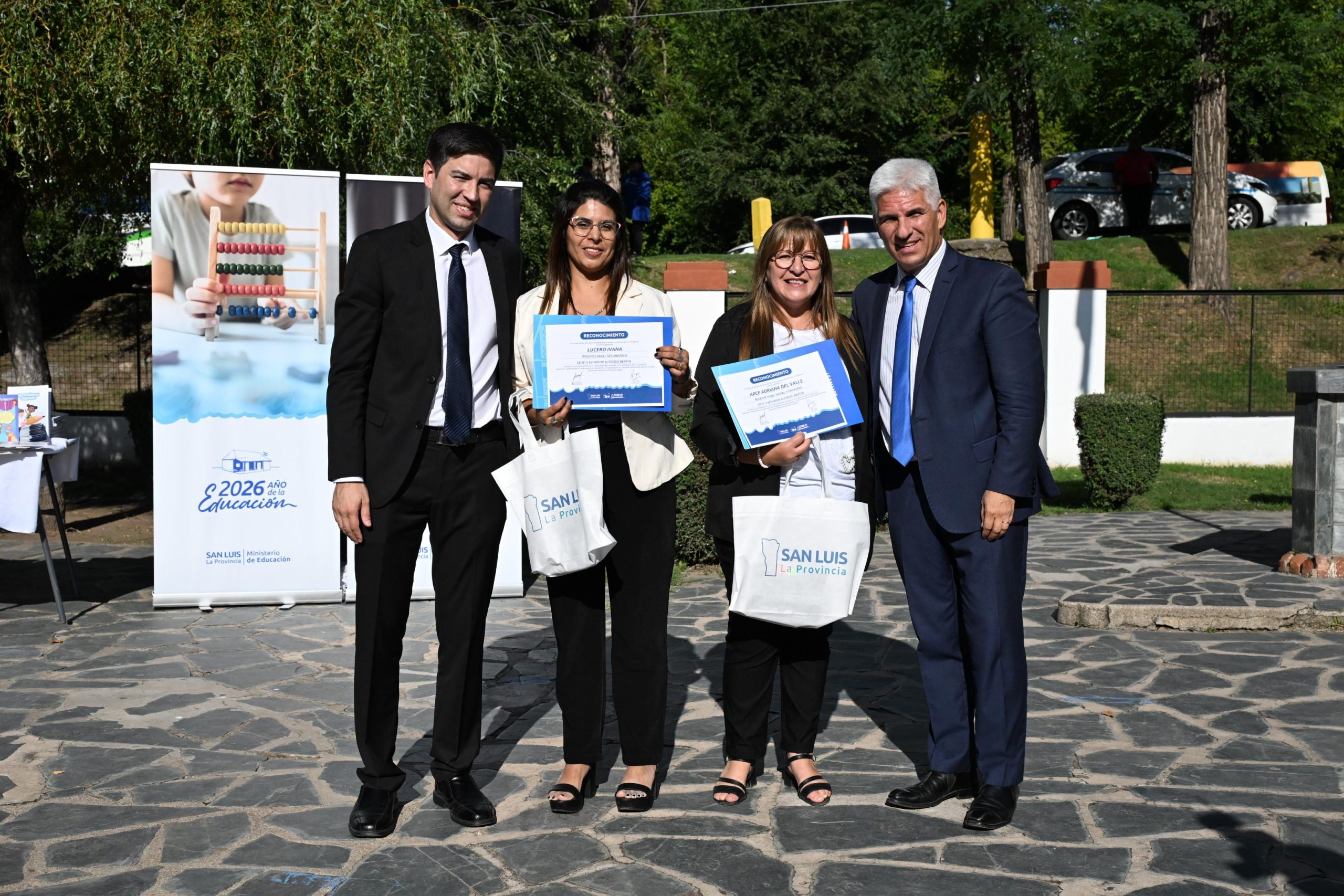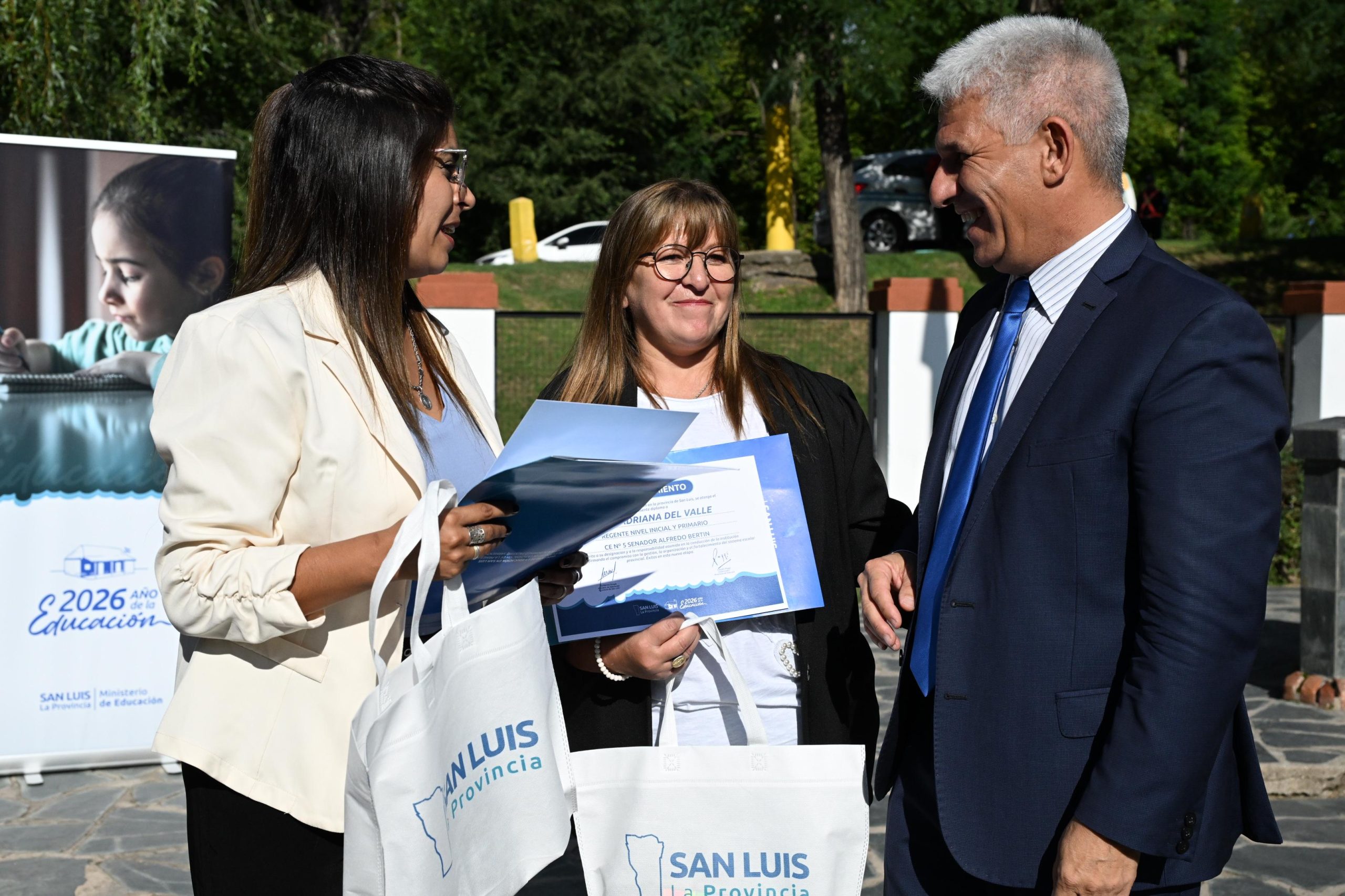Durante el acto que se desarrolló en el Centro Educativo N°5 ‘Senador Alfredo Bertín’ de El Trapiche, el gobernador Claudio Poggi reconoció a Adriana Arce, regente de los niveles Inicial y Primario, y a Ivana Lucero, regente del nivel Secundario, por haber completado con éxito el Concurso de Cargos Jerárquicos impulsado por el Ejecutivo en 2025.
