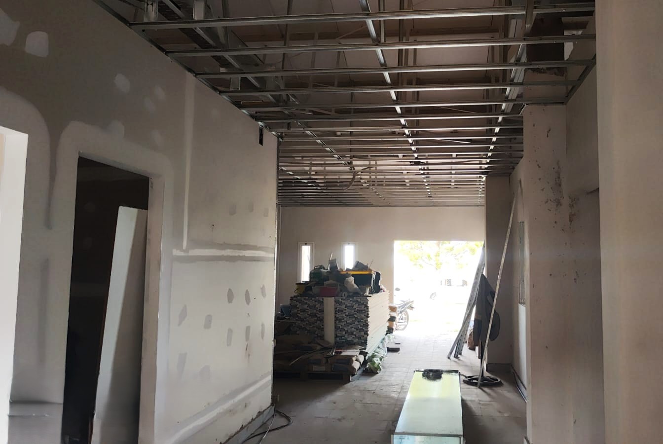 En esta etapa, las tareas se concentran en la colocación de cielorrasos con perfilería metálica y en las terminaciones interiores, con paredes listas para pintura y materiales ya acopiados para las instancias finales. Además, se avanza con la impermeabilización de la losa en el sector de comedor, la instalación de bandejas portacables y artefactos de climatización.