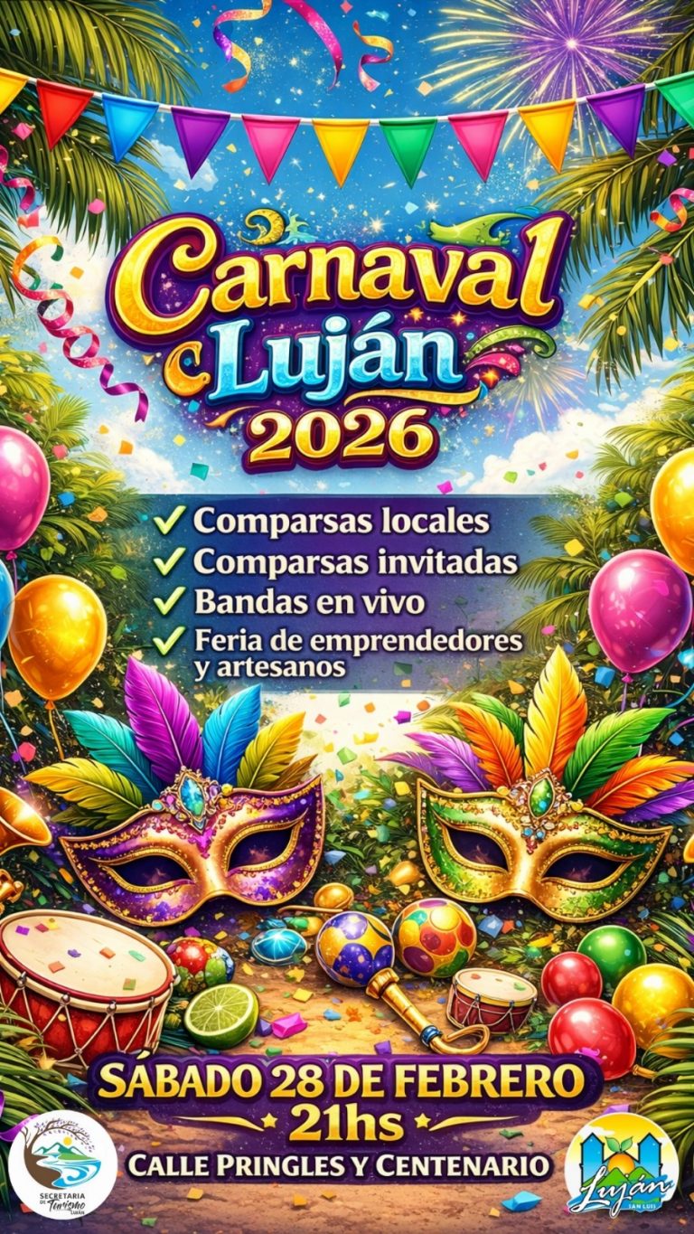 Luján vivirá una de las noches más esperadas del verano con la llegada del Carnaval 2026, una propuesta que llenará de color, música y alegría las calles de la localidad. El sábado 28, a partir de las 21:00, vecinos y visitantes están invitados a disfrutar de esta gran fiesta popular en la intersección de Pringles y Centenario.