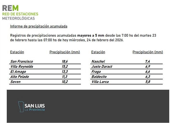 Durante la noche de este martes y madrugada del miércoles, la lluvia cayó en al menos 10 localidades, y las mismas condiciones podrían repetirse durante la jornada. Esta mañana, la Red de Estaciones Meteorológica (REM) anunció que el de hoy será un día inestable y con leve descenso de las temperaturas.