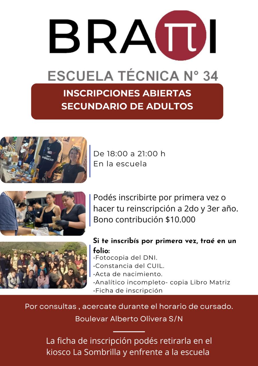 Continúan las inscripciones para el secundario de Adultos de la Escuela Técnica Nº34 ‘Arístides Bratti’. Uno de los pilares de esta modalidad es el vínculo humano que se construye entre docentes y estudiantes, basado en la cercanía, la escucha y el acompañamiento permanente. El trabajo pedagógico se organiza de manera modular y por proyectos, abordando situaciones reales de aprendizaje, vinculadas con problemas del contexto, la participación ciudadana, el cuidado del ambiente y el mundo del trabajo.