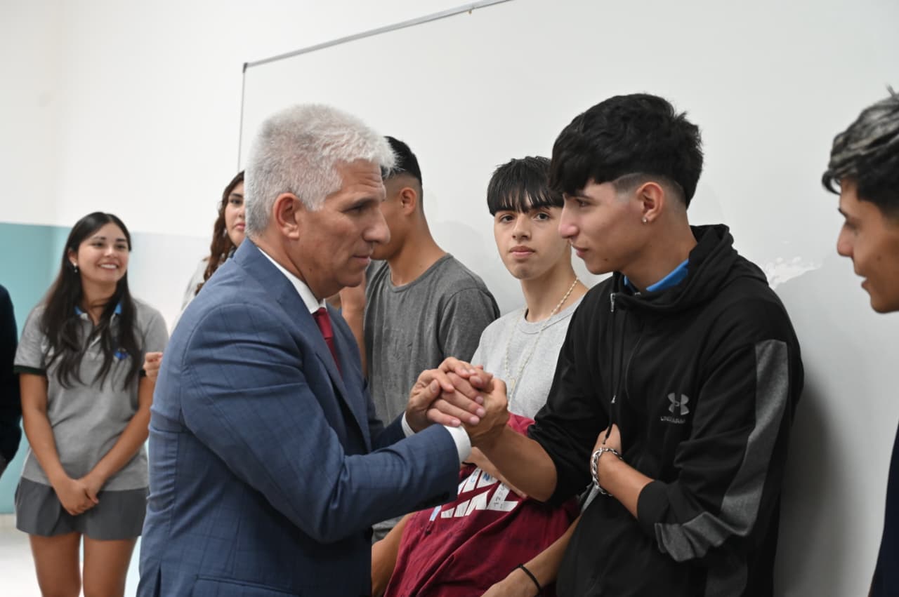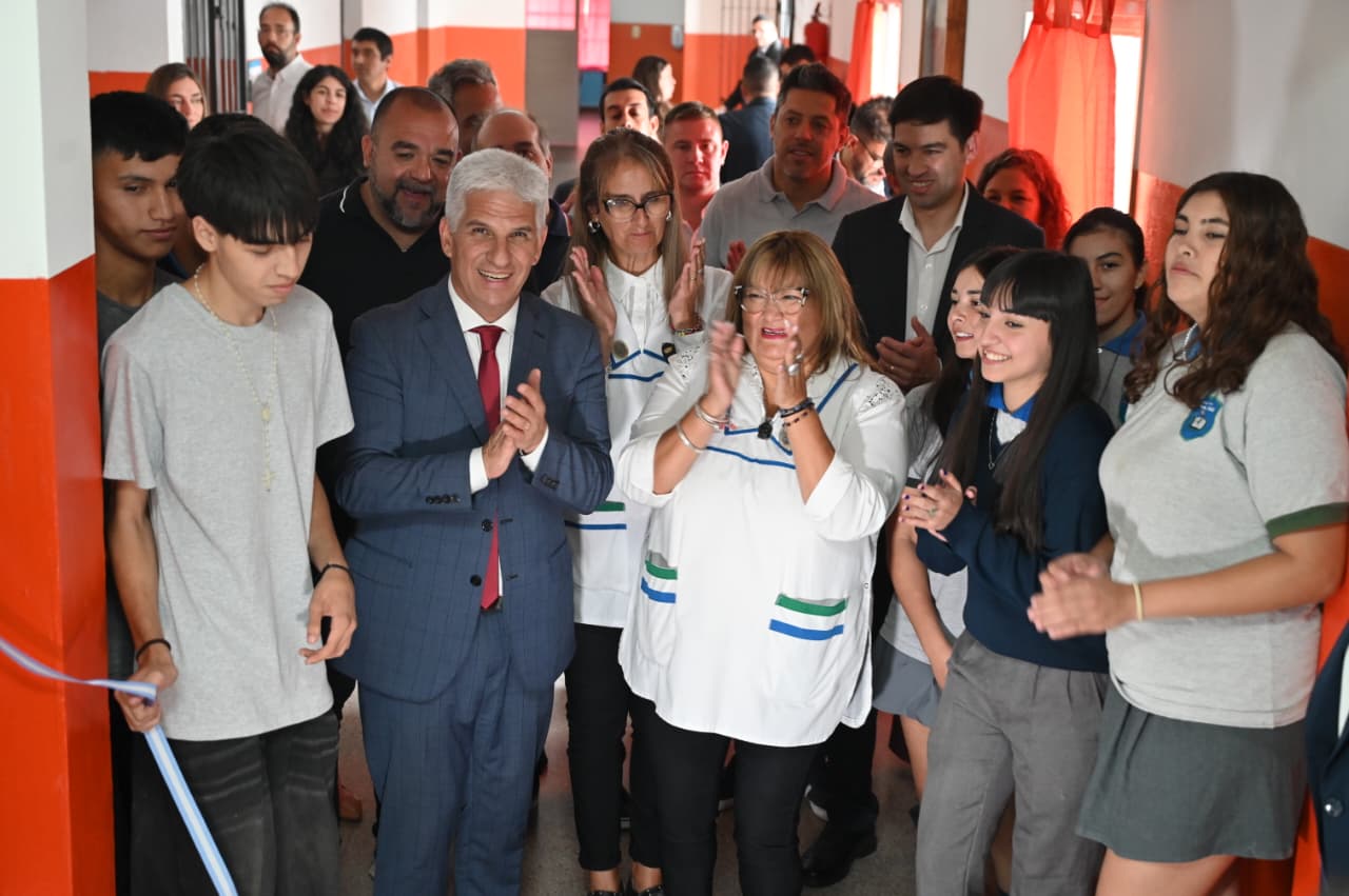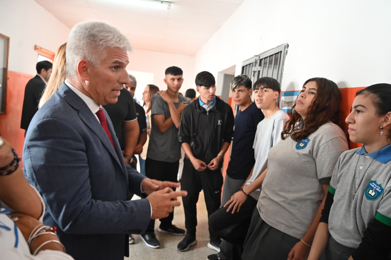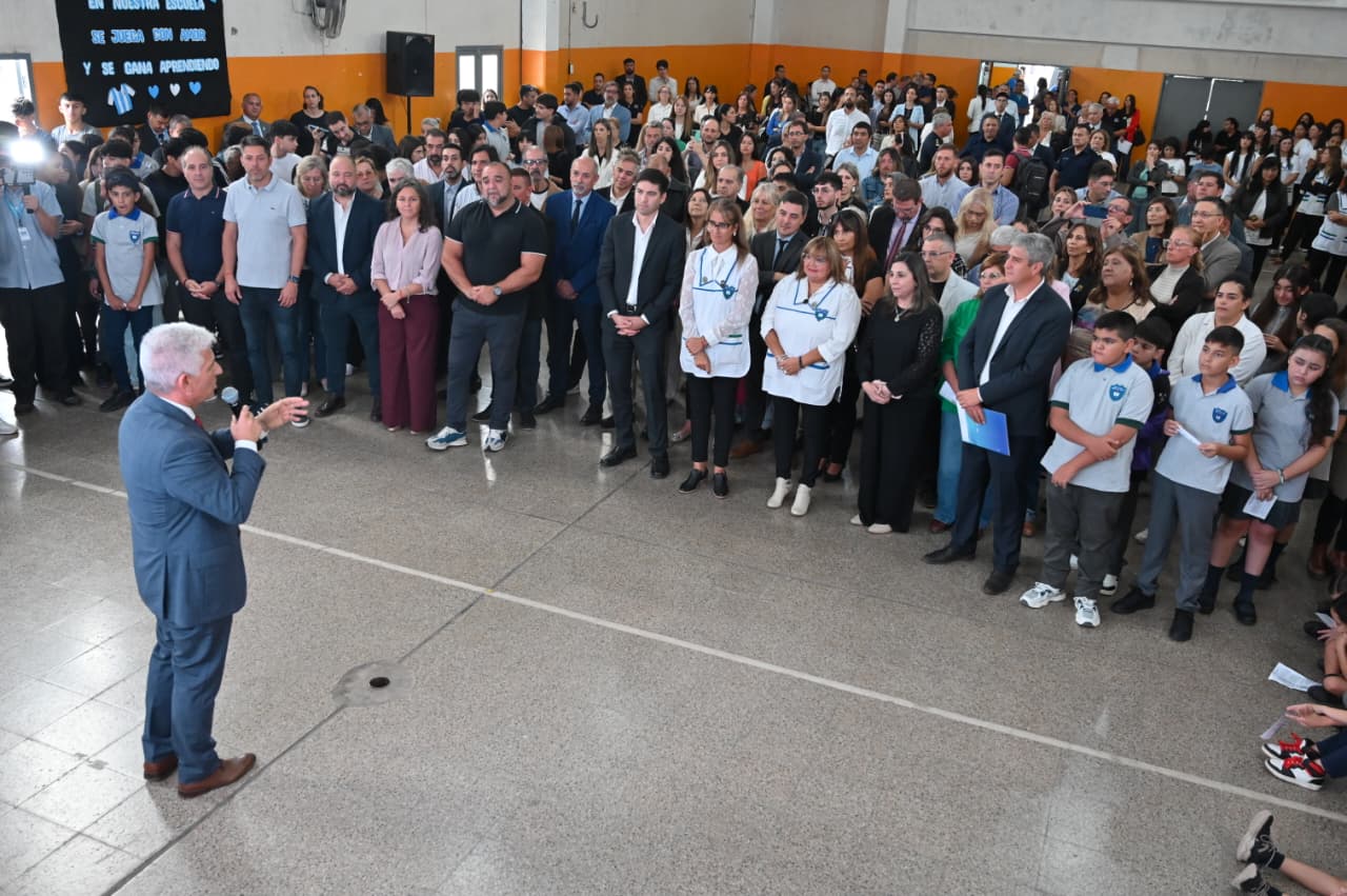 “Hoy es muy grato visitar esta escuela. La primera vez que vine en 2024, los primeros meses, porque habíamos hecho unos arreglos edilicios urgentes de mantenimiento, llegué y la escuela se estaba despoblando, cada vez había menos chicos, sobre todo en el Secundario. ¿Por qué? Porque el Secundario llegaba solamente hasta tercer año. Entonces un papá, una mamá, cuando su chico está en el primario, elige otra escuela para asegurarse los seis años, no asegurarse tres, porque a los tres tienen que romper el grupo, las amistades e ir a buscar otro banco. Me acuerdo que me junté con los chicos de tercer año, que deben ser los que hoy van a 5°, fui a un aula y charlé con ustedes. Era su último año en la escuela si no cambiábamos algo”, dijo, y cambió con la inauguración de hoy.