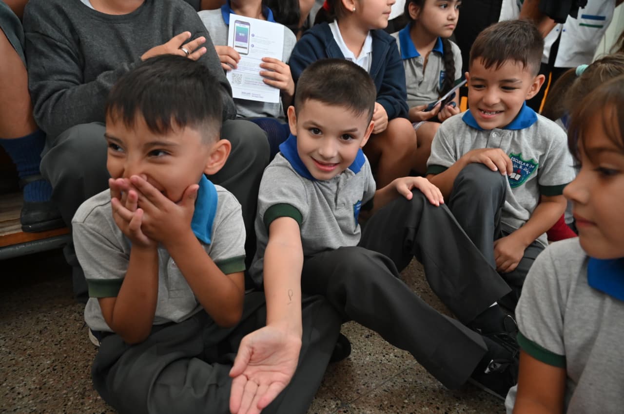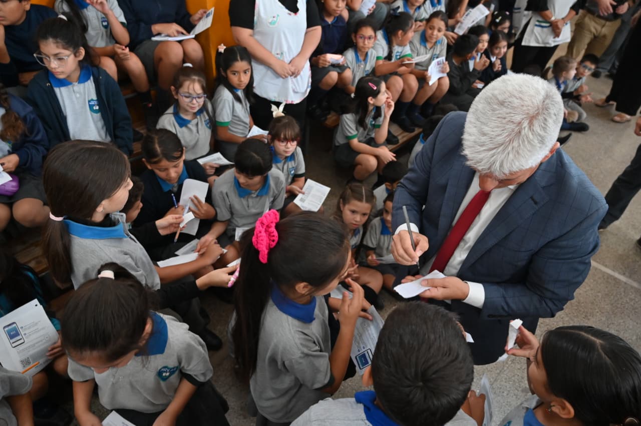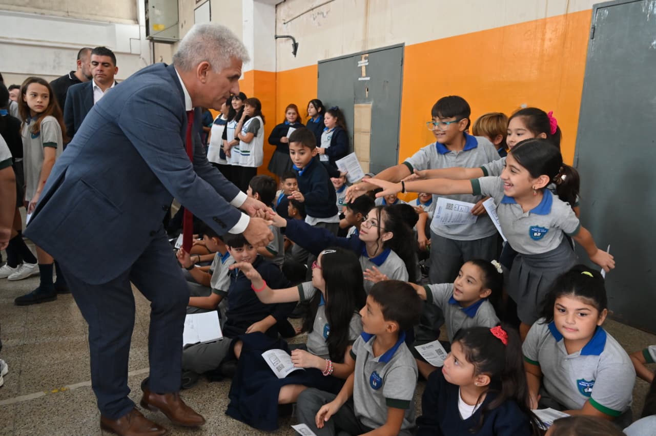 La actividad formó parte de la Gira Educativa que el primer mandatario comenzó el lunes, junto con el inicio del ciclo lectivo 2026, e inició con el descubrimiento de una placa conmemorativa en el hall de ingreso a la institución con la inscripción: ‘Obra inaugurada en el Año de la Educación’. Poggi firmó el libro de visitas y, como es habitual, saludó a chicos, docentes y personal de maestranza.