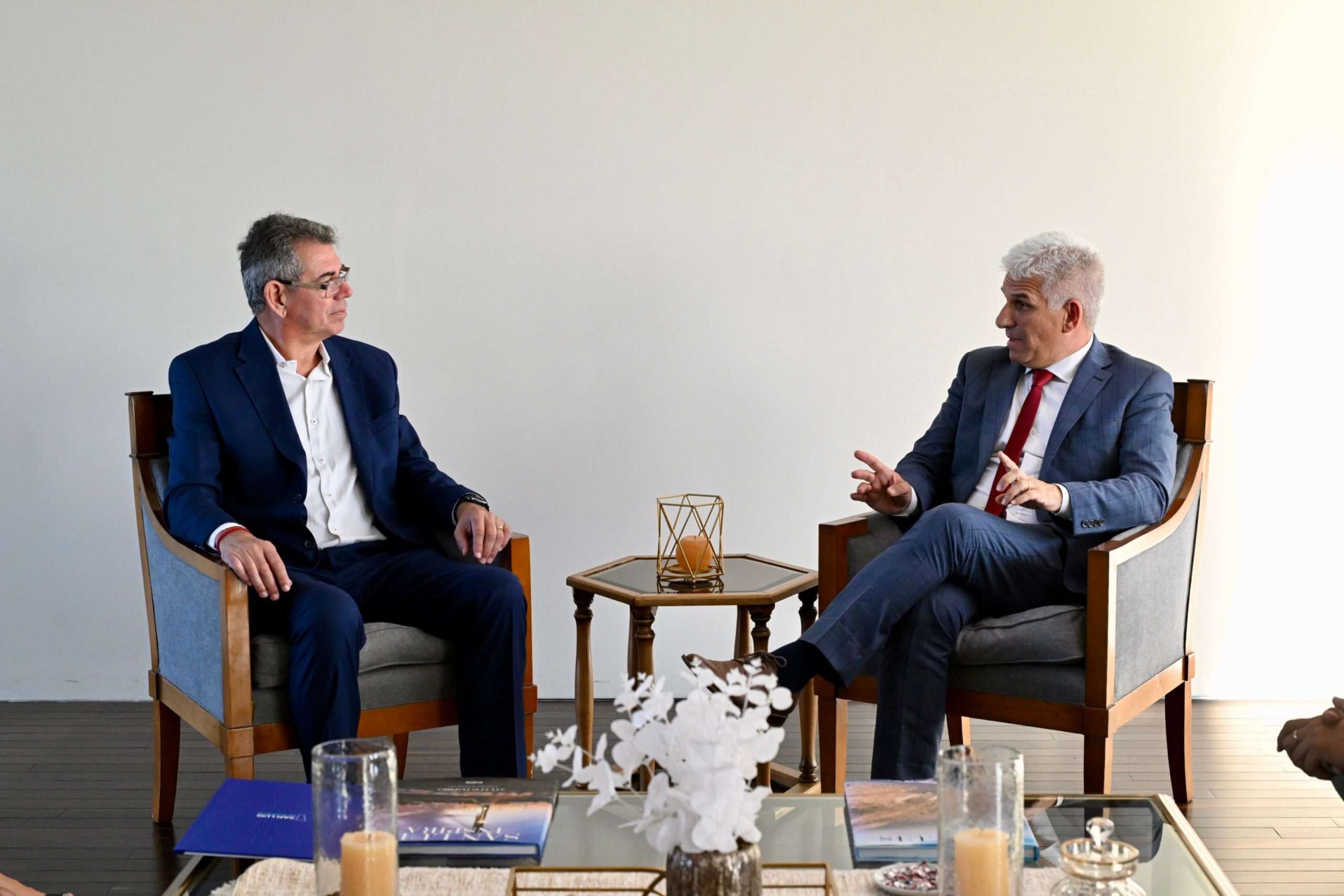Este jueves a la tarde, el gobernador Claudio Poggi recibió en su despacho a Guillermo García y Juan Manuel López, presidente y gerente general, respectivamente, de Calicanto Solar SA, firma responsable del nuevo predio energético que se erige en Nogolí. Del encuentro también participaron autoridades de la secretaría General de la Gobernación, del ministerio de Desarrollo Productivo y de la secretaría de Ambiente y Desarrollo Sustentable.