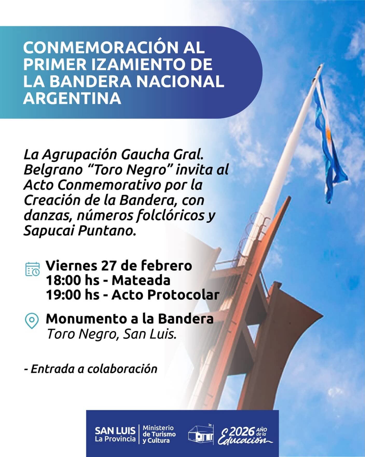 A más de dos siglos de aquel hecho histórico, la fecha continúa convocando a instituciones y comunidades a rendir homenaje al símbolo patrio. En la provincia de San Luis, la Agrupación Gaucha General Belgrano ‘Toro Negro’ invita a participar del acto conmemorativo por el Primer Izamiento de la Bandera Nacional Argentina, este viernes 27 en el Monumento a la Bandera de Toro Negro.